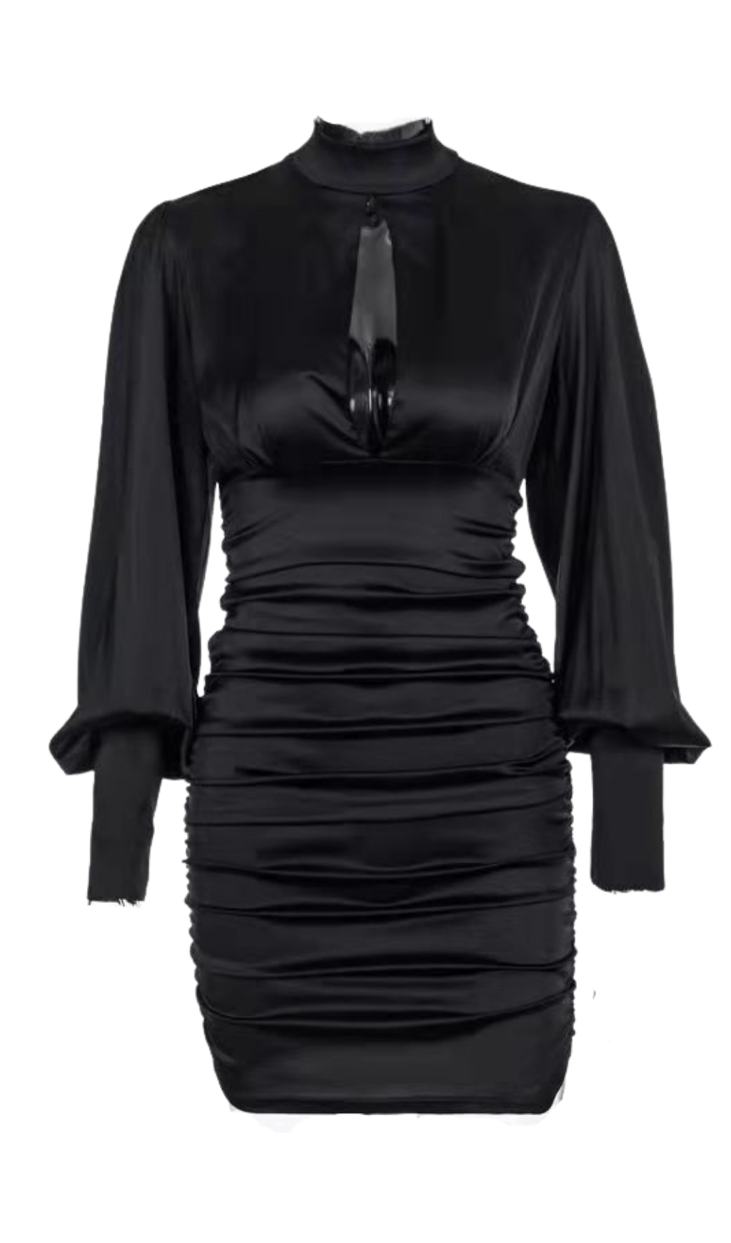 The ultra-deep waistband of this dress is designed to tighten the waist and truly define your shape. We love the dramatic waterfall effect on the skirt, and the gathering at the sides accentuates your curves. The skirt rises in the middle of the front, revealing a hint of thigh as the drape crosses over. The long and narrow sleeves add a stylish overall atmosphere to this dress.