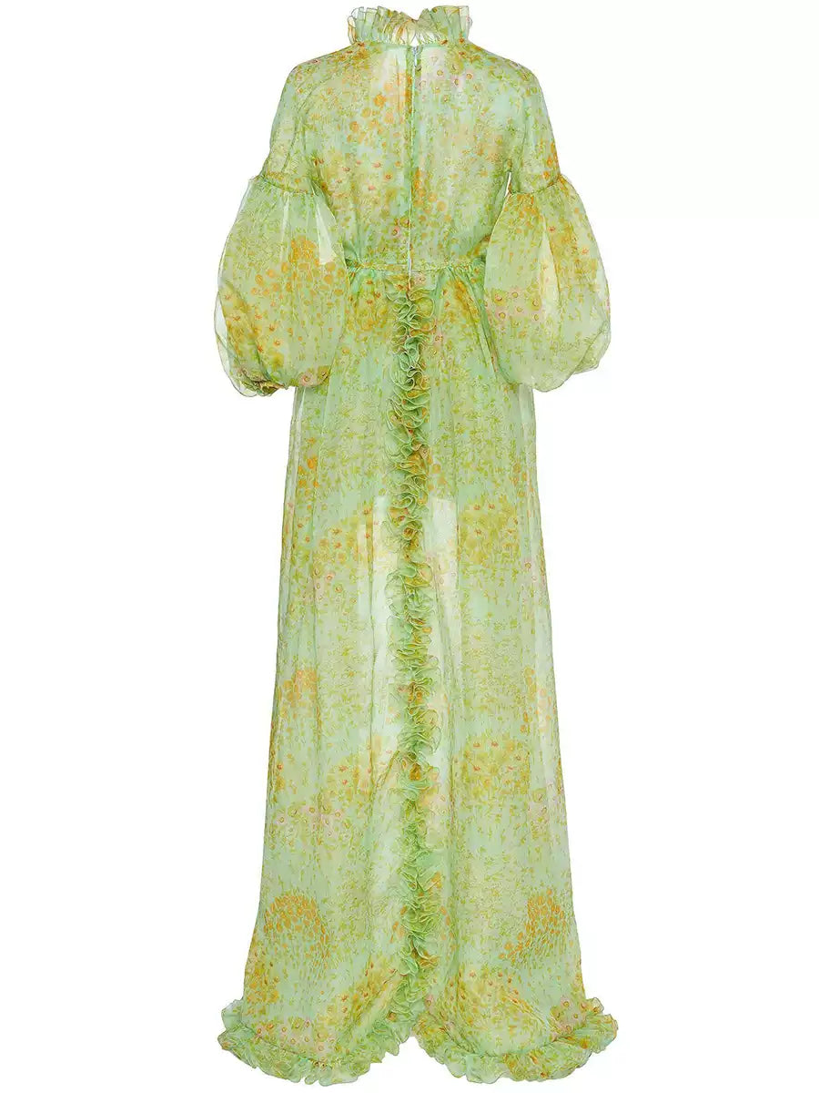 Green Elegant Floral Chiffon Maxi Dress with Ruffles and Belt