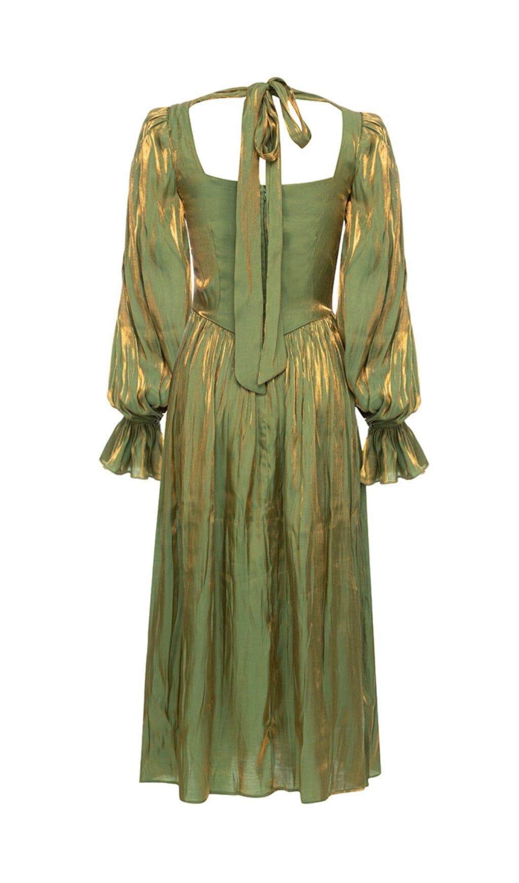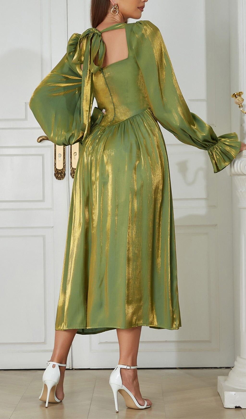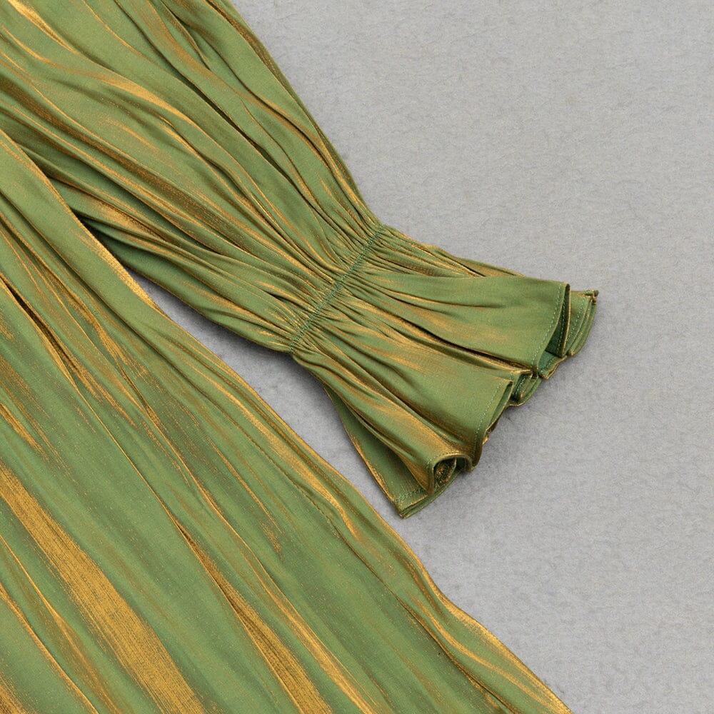 GREEN LOW-CUT PUFF SLEEVE PLEATED LOOSE DRESS