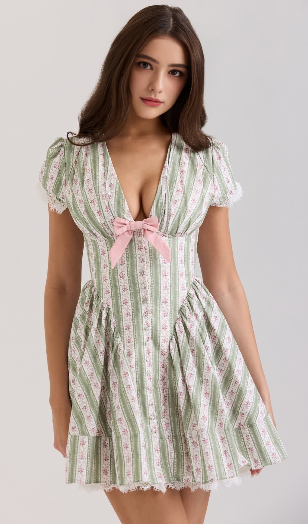 GREEN STRIPE FLORAL PRINT MINI DRESS WITH BOW DECORATION