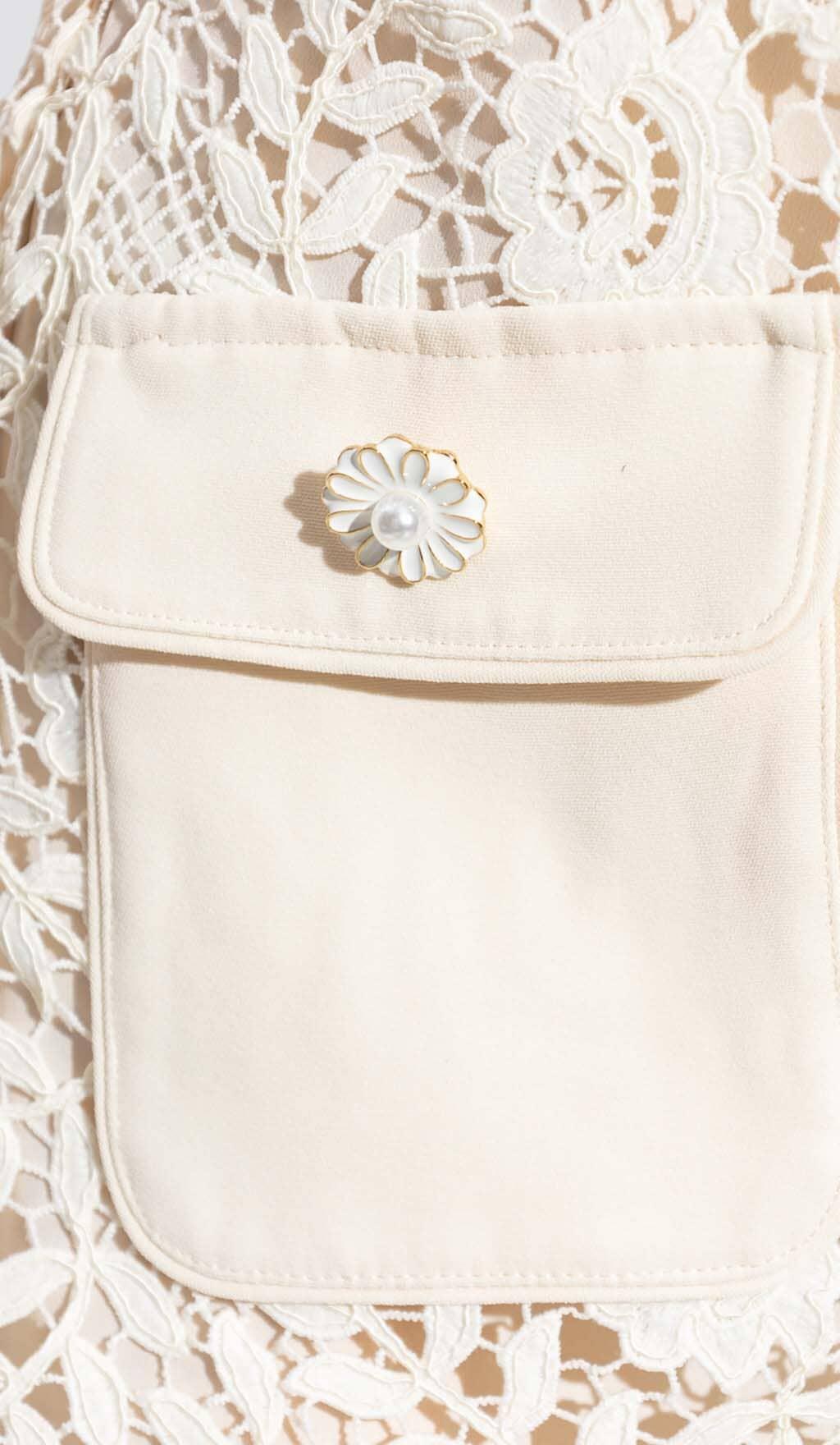 GUIPURE LACE FLAP POCKETS JACKET DRESS IN WHITE