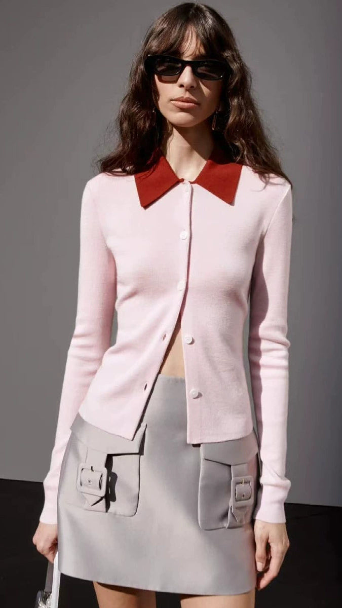 Step into a world where classic meets contemporary with our stunning Haide Contrast Collar Long Sleeve Knit Polo Top. Designed for the modern American woman, this isn't just a polo—it's a style statement. The eye-catching dark red contrast collar perfectly pops against the soft, alluring light pink knit, offering a sophisticated twist on a timeless silhouette.