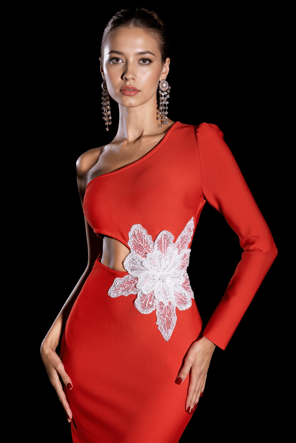 Elevate your wardrobe with the Hailey Sunflower Cutout High-Slit One-Shoulder Maxi Dress. This stunning ensemble features intricate sunflower-inspired cutouts that exude a natural elegance, perfectly balancing charm and sophistication.