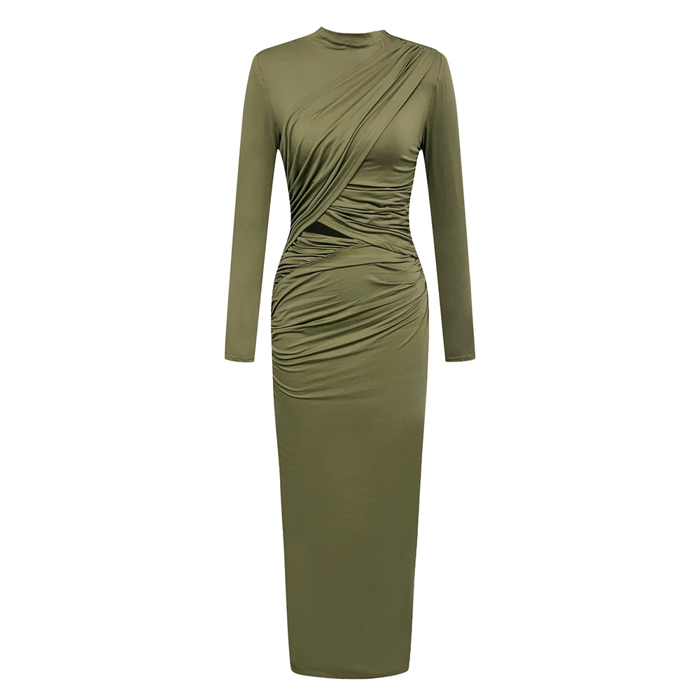 It is a sophisticated and stylish pick for any special occasion. With an eye-catching pleated finish and half-turtleneck design, this dress creates an effortlessly elegant look. The hollow details and long sleeves add an exquisite touch of subtle luxury. Enjoy the quality and craftsmanship when you wear this stunningly tailored dress.