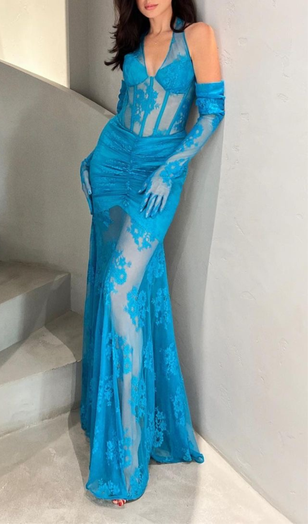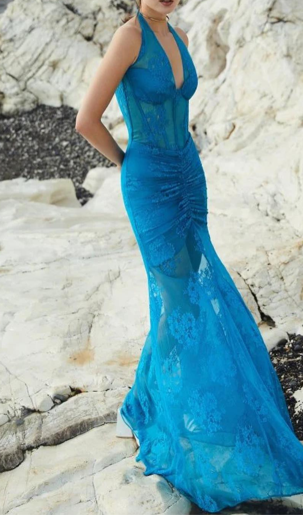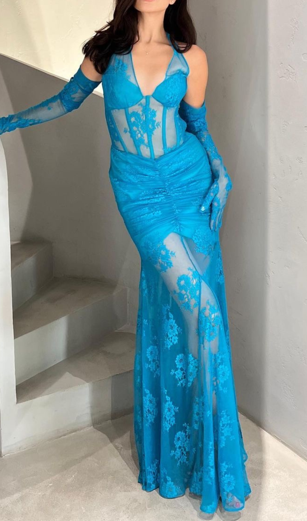 HALTER BUSTIER LACE MERMAID MAXI DRESS IN BLUE