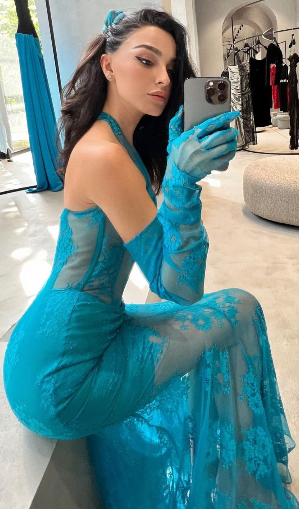 It features a unique halter neckline and a flattering bustier lace bodice that accentuates your curves. The mermaid silhouette adds a touch of elegance while the vibrant blue color will make you stand out in a sea of black dresses.