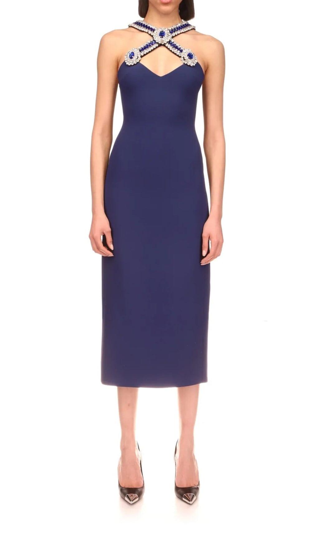 HALTER CRYSTAL MIDI DRESS IN DEEP SEA BLUE