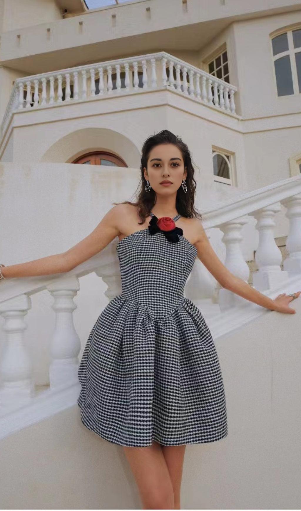 HALTER HOUNDSTOOTH BOW MINI A-LINE DRESS