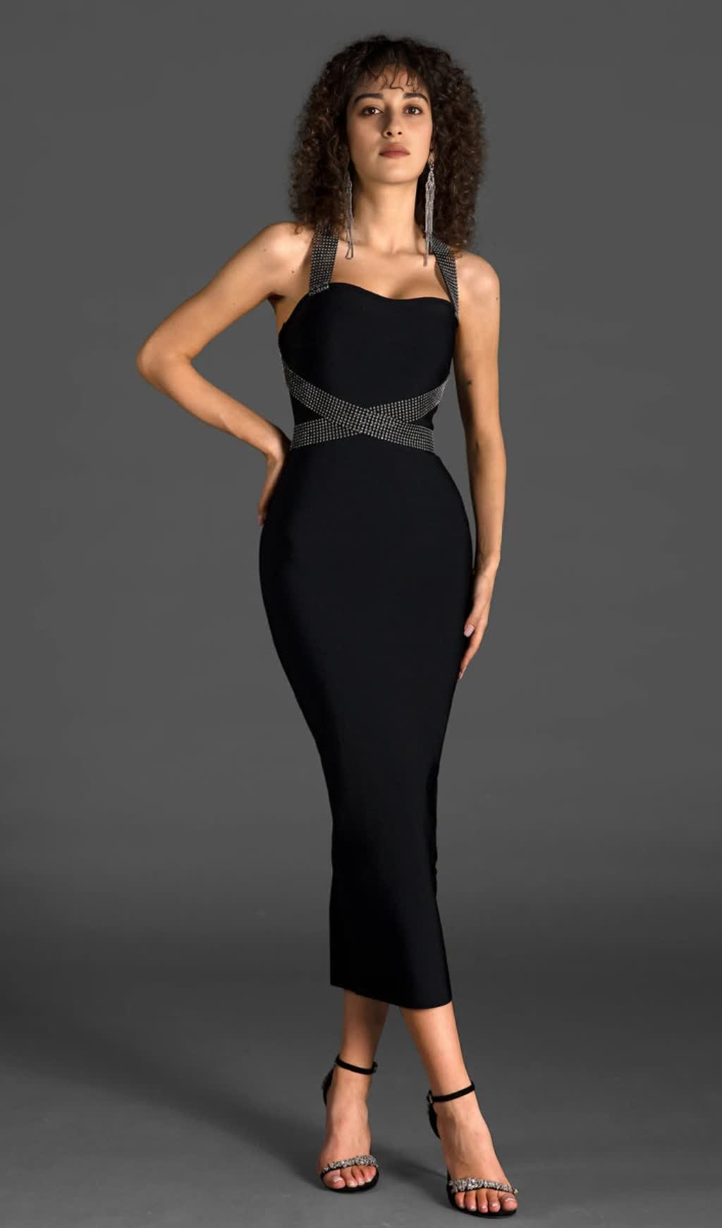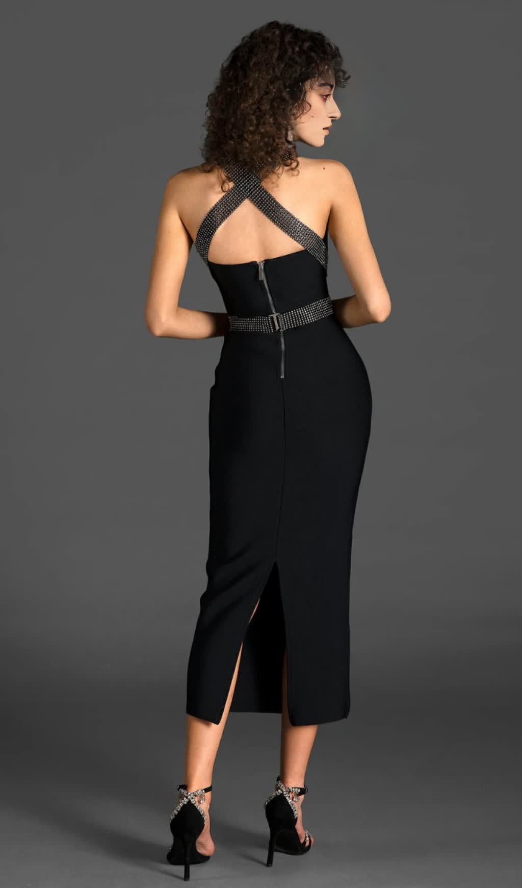 HALTER RHINESTONE MIDI DRESS IN BLACK