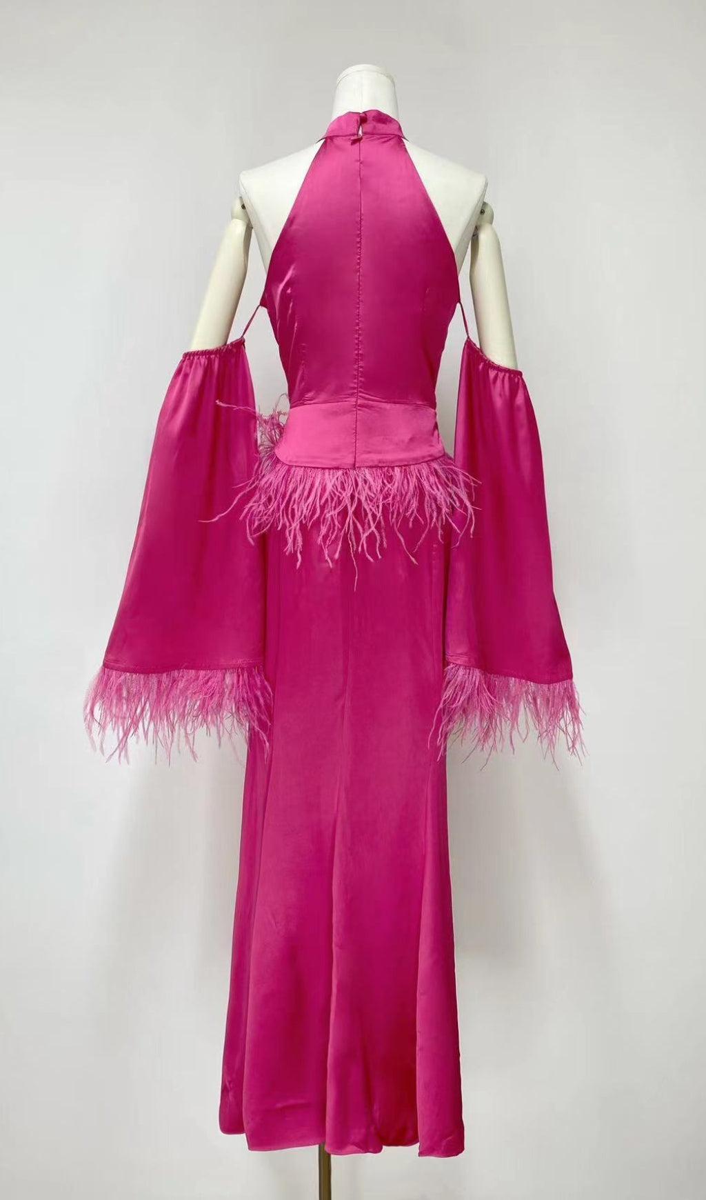 HALTERNECK FEATHER SATIN DRESS IN PINK