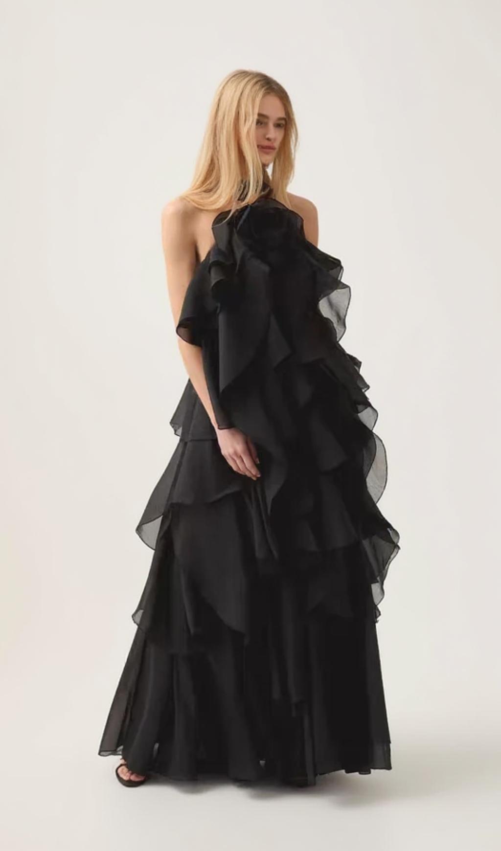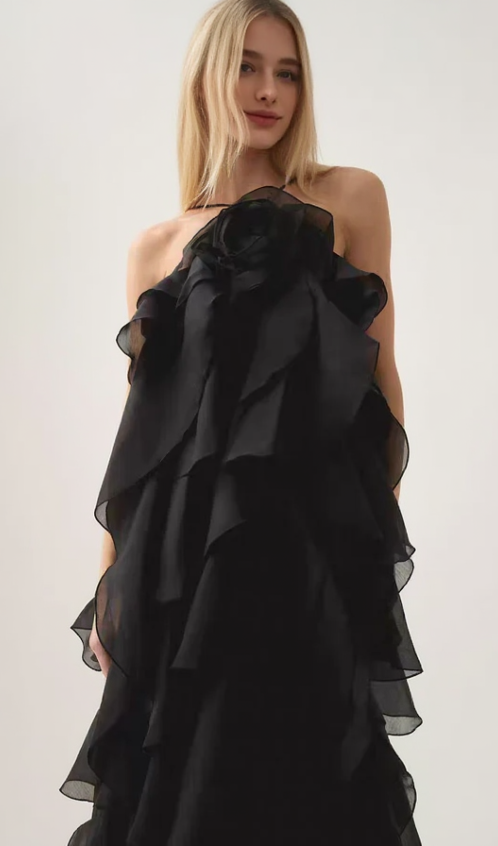 This halterneck flounced maxi dress in black is a versatile and stylish addition to any wardrobe. The halterneck design provides a flattering fit, while the flounced hem adds a playful touch. Perfect for any occasion, this dress is made of high-quality materials, ensuring comfort and durability. Elevate your style with this must-have piece.