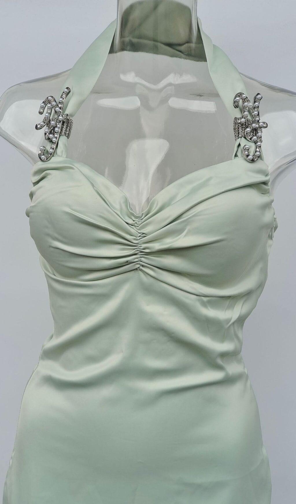 Seeing this dress always makes people feel the taste of summer. The color of mint green is so fresh and bright, which is very suitable for any skin tone. The diamond-inlaid flower pattern connected with the design of the neck adds a touch of elegance to the dress. The pleated chest design enhances the glossy material, making it less monotonous. This dress is perfect for summer parties and gatherings.