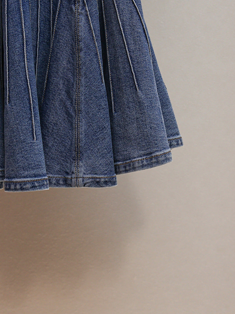 The dress features a flattering, tailored bodice that cinches gracefully at the waist, leading into a playful and chic pleated mini skirt. This design not only offers beautiful movement but also creates a universally flattering A-line silhouette. A row of charming, ornate buttons down the front adds to its refined aesthetic, while the premium, soft blue denim ensures both comfort and durable style for all-day wear.