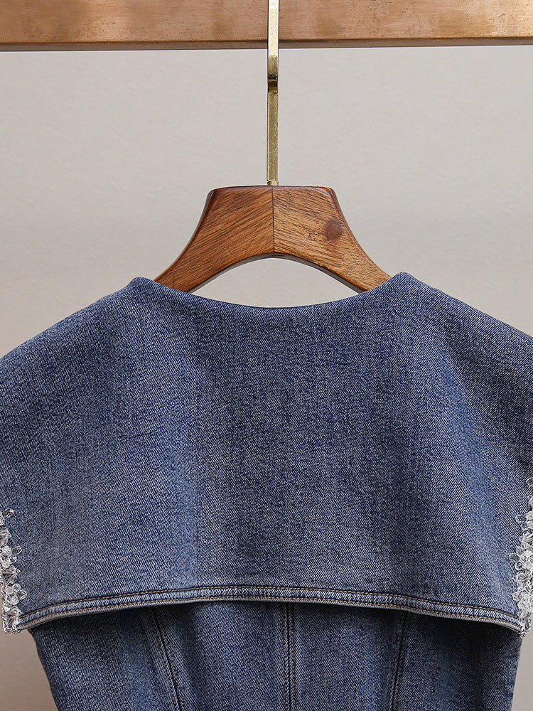 Its most distinctive feature is the exquisite, oversized sailor collar, lavishly adorned with intricate, shimmering embellishments. Imagine delicate sparkling beads, sequins, or a beautiful lace trim that catches the light, instantly elevating the traditional denim silhouette and ensuring you make a memorable impression wherever you go.