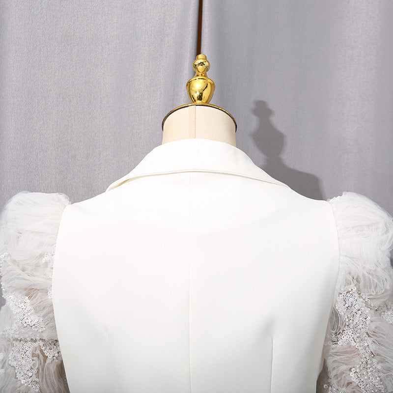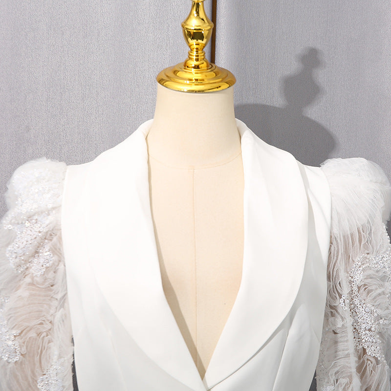 • Exquisite Sequin & Lace Sleeves: Long, sheer sleeves crafted from delicate lace are intricately adorned with shimmering sequins and beads, adding a breathtaking sparkle and texture that catches the light beautifully.