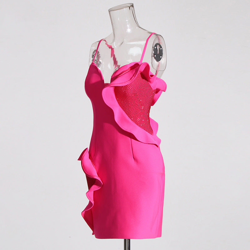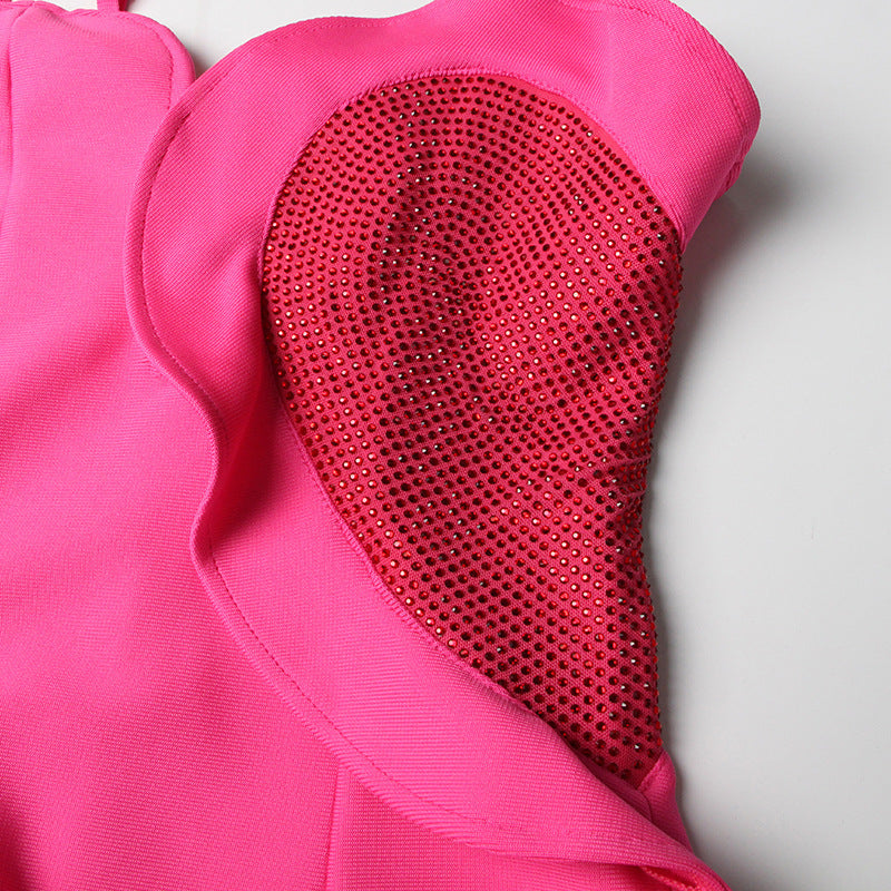 This PINK Mini Dress Is Covered in Sparkling crystals in the Shape of Hearts. It’s a Fun and Flirty Look That’s Perfect for a Night Out. The Sleeveless Design and V-Neckline Keep It Sexy, While the Ruffled Hem Adds a Touch of Girly Flair.