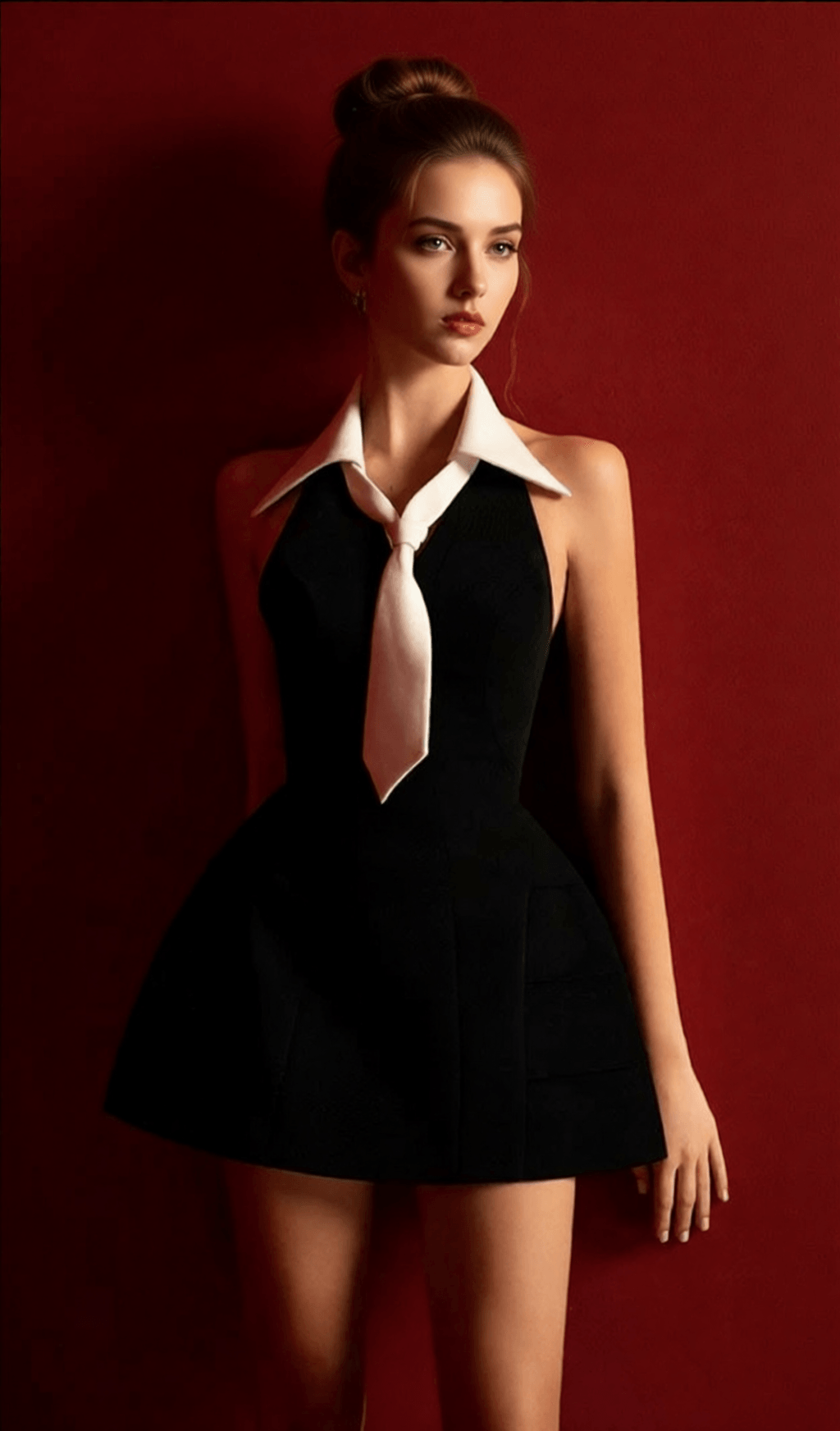 • Striking Contrast Design: Features a bold, crisp white collar and a wide, adjustable tie that instantly elevates the classic black halter-neck silhouette. This iconic detail allows for personalized styling, from a neat knot to a slightly looser drape.