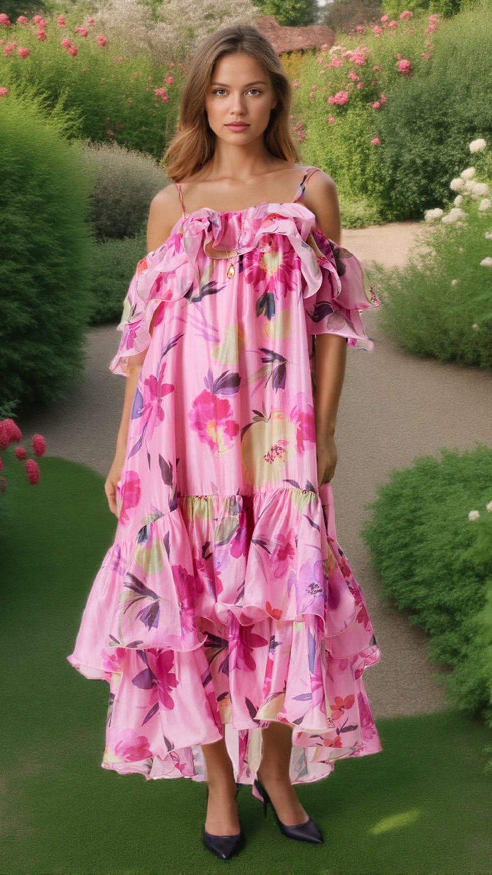 The Hedwig off-shoulder maxi dress in rose red features an elegant floral print and delicate ruffle detailing, combining classic femininity with modern design. The off-shoulder neckline highlights the collarbones, while the flowing maxi length offers graceful movement and comfort. Perfect for formal occasions or stylish daytime events, this dress enhances your silhouette with a flattering fit and eye-catching pattern.