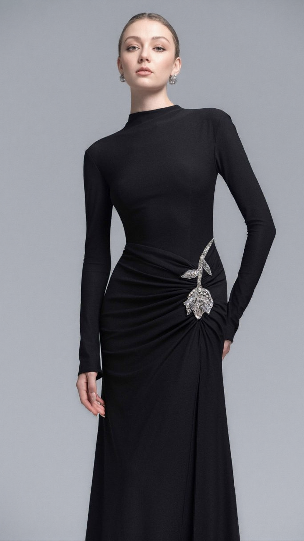 This black Hedwig Rose gown features delicate embellishments that add refined elegance to its gathered sheath silhouette. Designed to flatter the figure, the gown combines sophisticated craftsmanship with subtle detailing, making it an ideal choice for formal occasions where understated luxury is essential. Its sleek fit and tasteful adornments ensure a timeless and polished appearance.