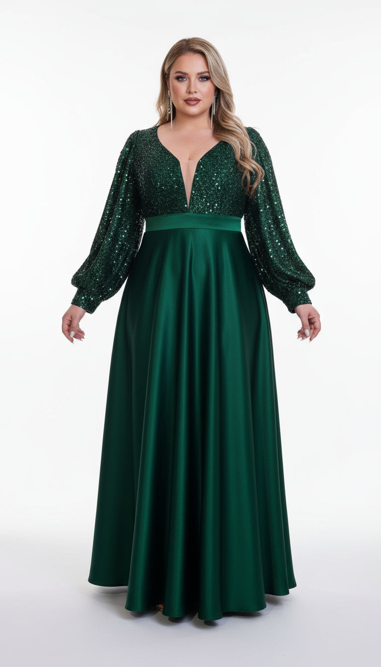 • Sparkling Sequin Bodice & Sleeves: The upper half of this magnificent dress is adorned with radiant emerald green sequins, creating a mesmerizing shimmer. Elegant long puff sleeves with elasticized cuffs add a touch of sophisticated drama.
