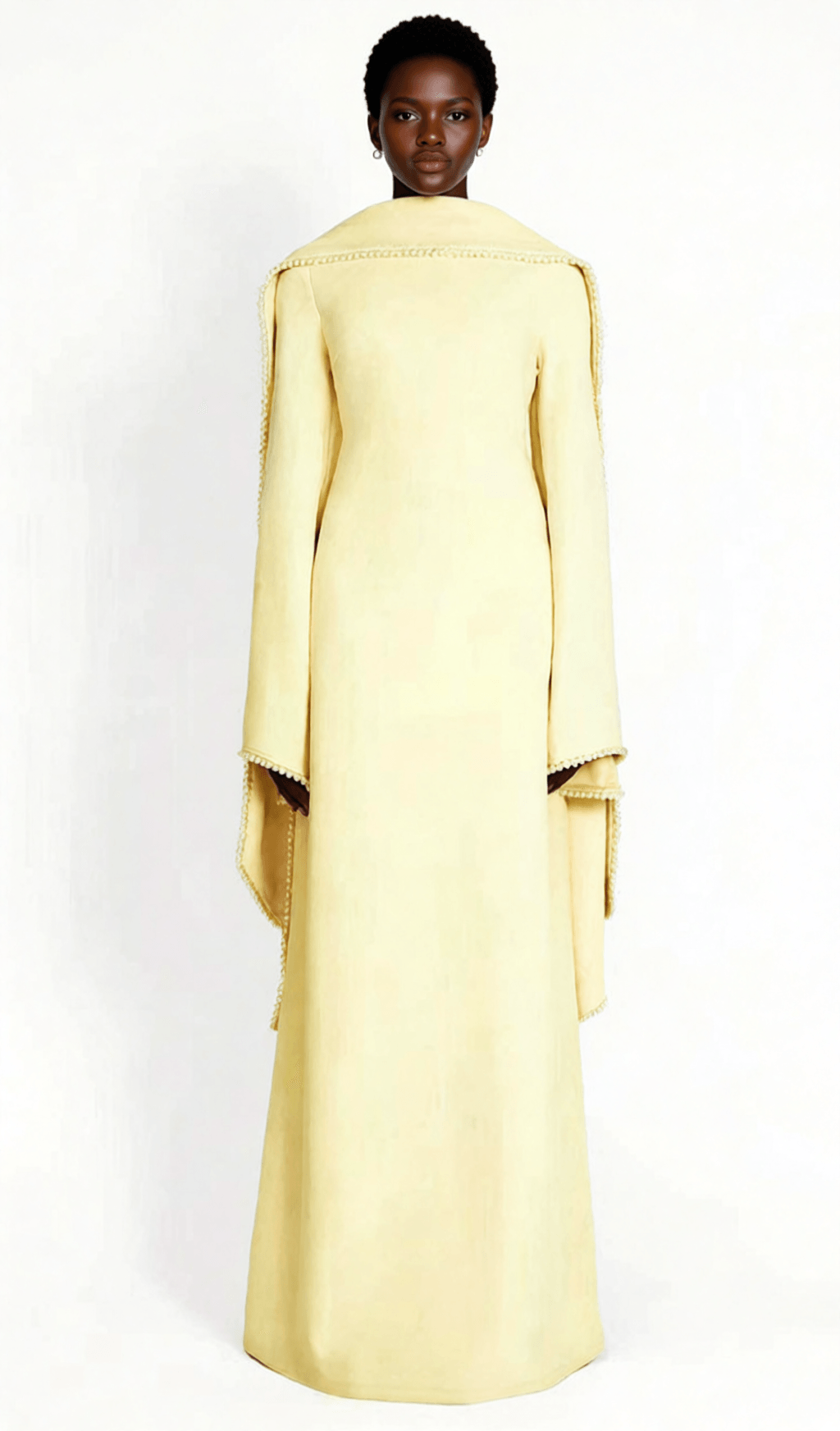Discover Timeless Elegance: The Hidi Shawl Pearl-Trimmed Maxi Dress