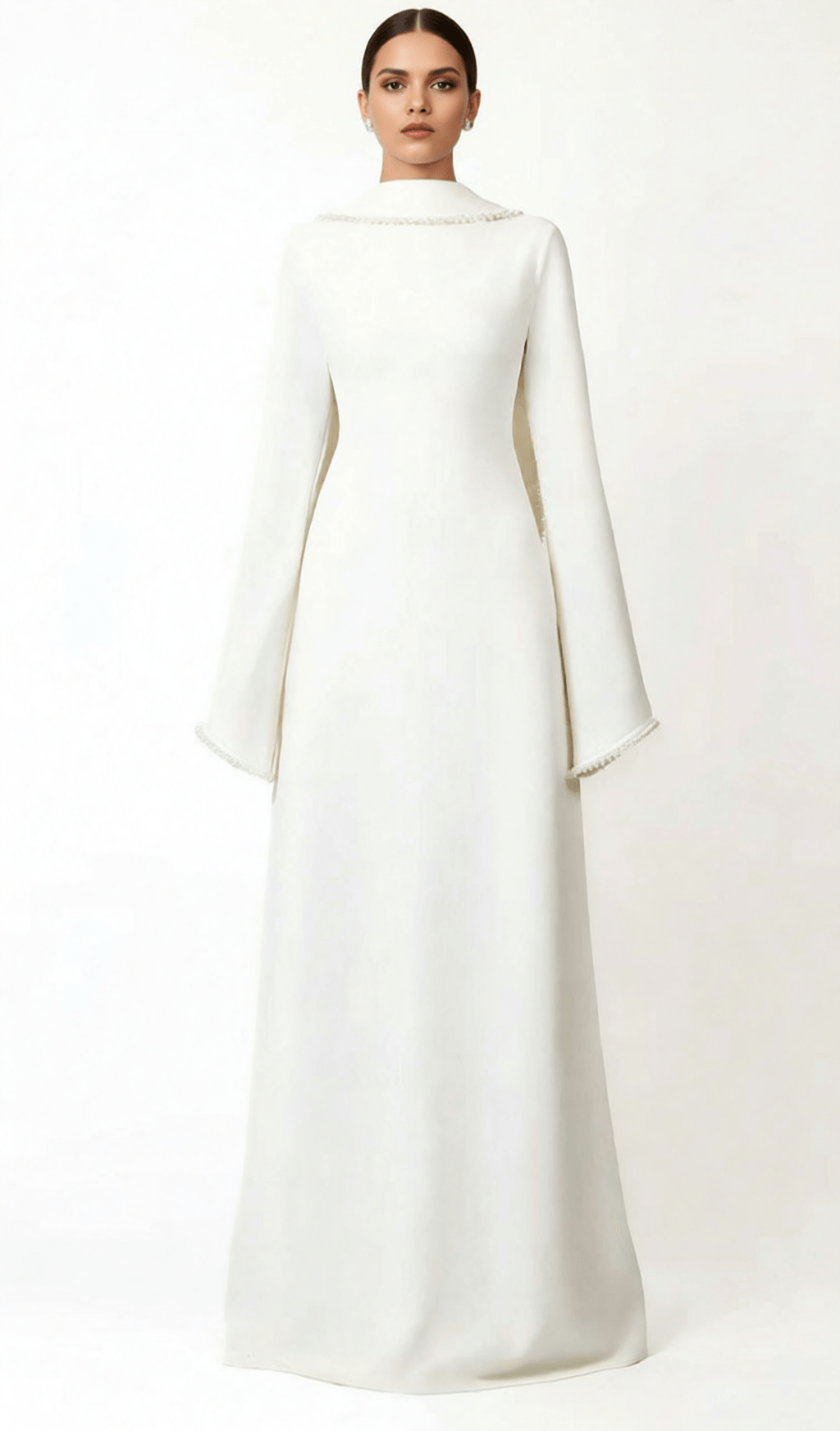 HIDI SHAWL PEARL-TRIMMED MAXI DRESS | ELEGANT LONG SLEEVE WHITE GOWN
