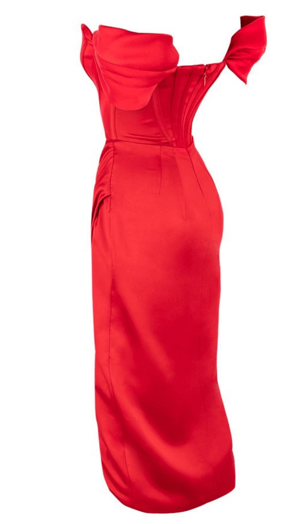 Introducing our High Waist Side Slit Slim-Fit Gown, made from ultra-luxurious double duchess satin in black. This gown is designed to give you a super sleek and languid vibe, making it perfect for any special occasion.