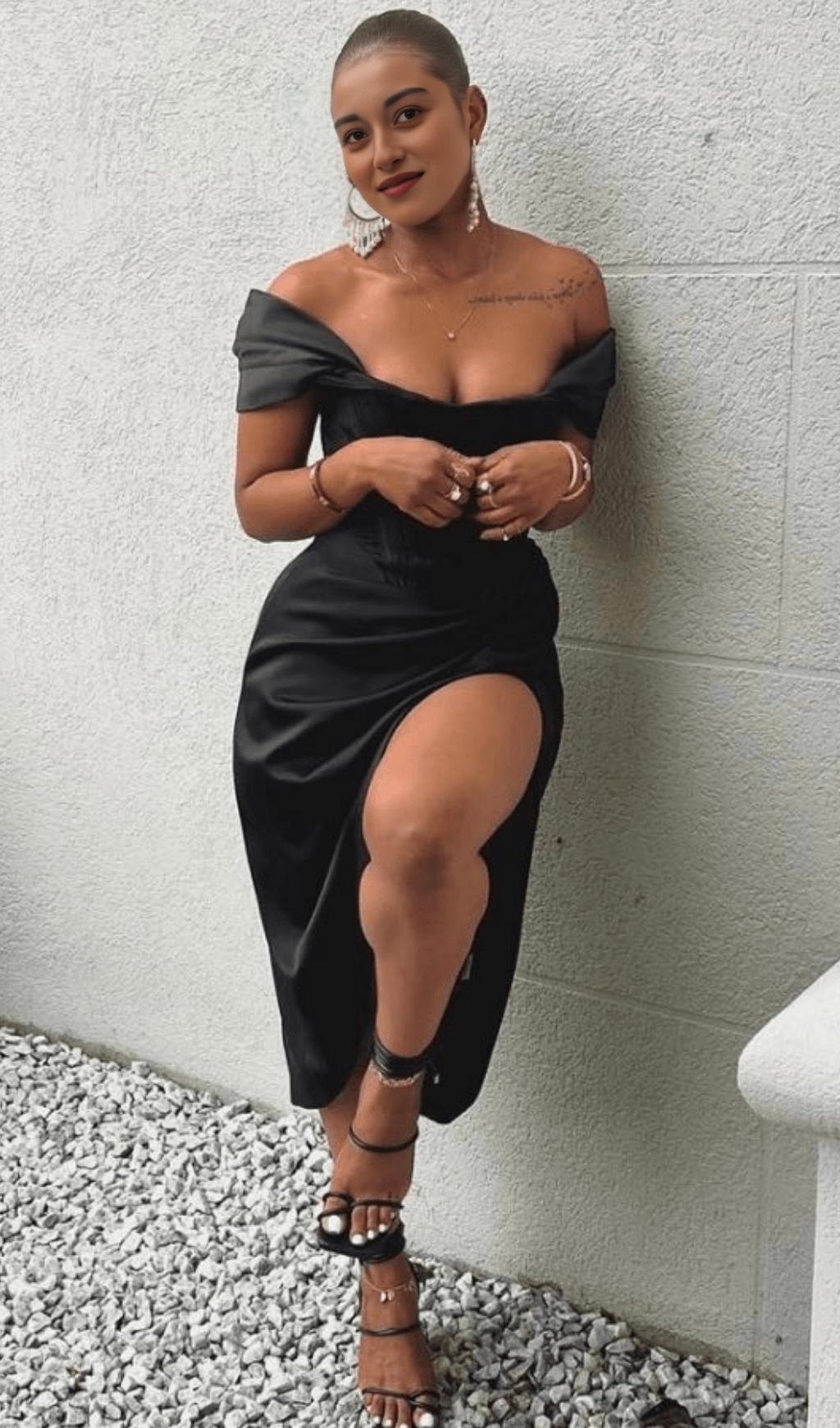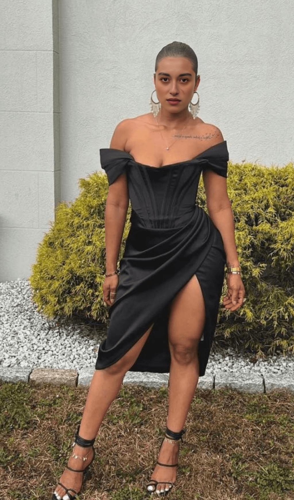 Indulge in the ultimate luxury with our Satin Off Shoulder Midi Dress in Black. Crafted from our ultra-luxurious double duchess satin, this dress exudes sophistication and elegance. Its off-shoulder design and languid vibe make it a standout piece for any occasion.