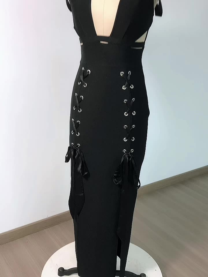 HOLLOW DOUBLE SLIT RIBBON MIDI DRESS IN BLACK
