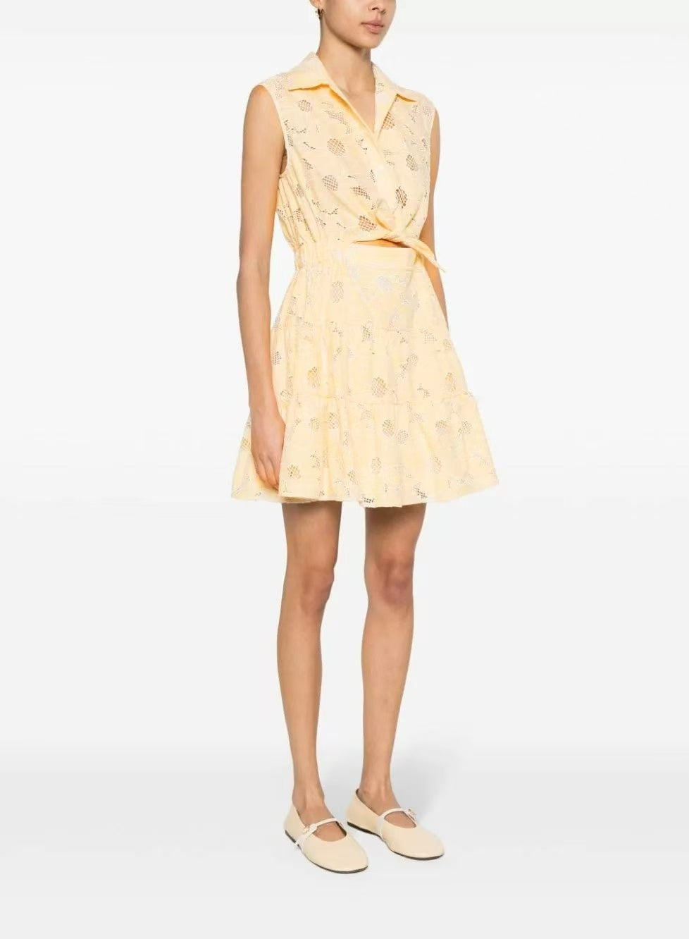 This is a sleeveless light yellow lace dress. The lace material gives it a delicate touch. Lace dates back to 16th - century Europe. Initially, it was handmade and extremely expensive, symbolizing nobility.