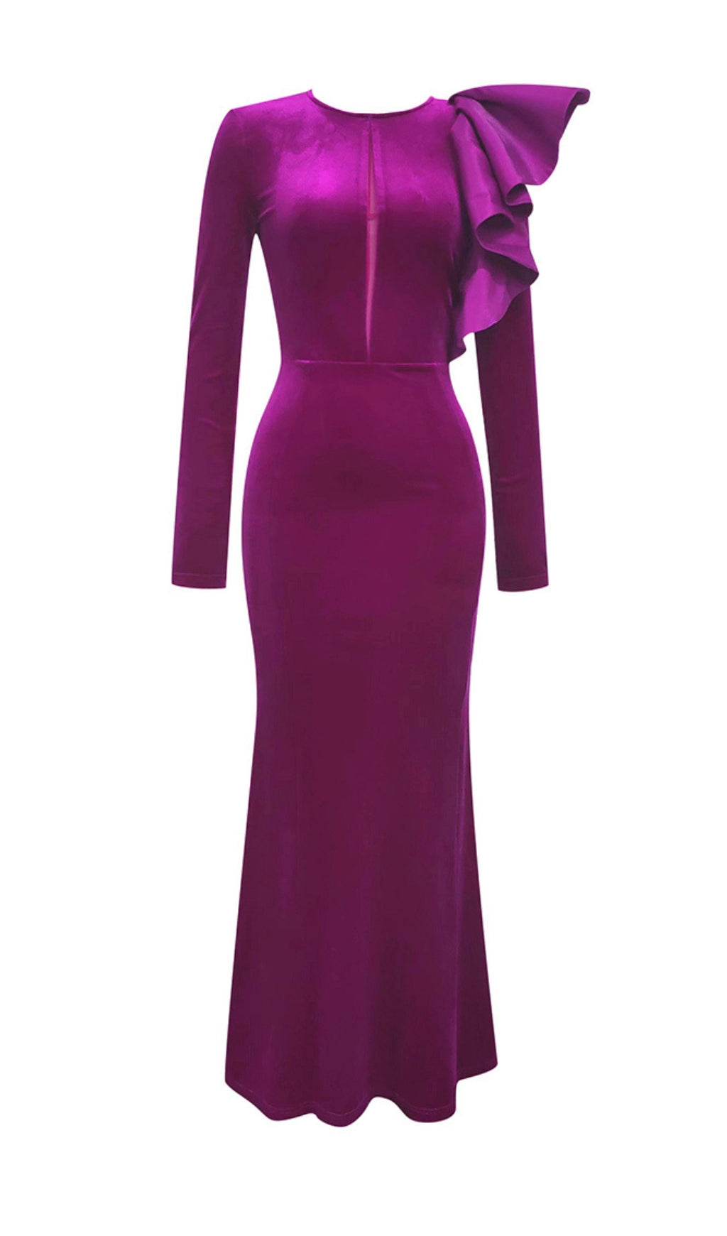 The intricate cut-out design and luxurious velvet material will make you stand out in any occasion. The lotus sleeves add a touch of elegance, while the fishtail hemline adds a dramatic flair. A must-have for any fashion-forward individual!