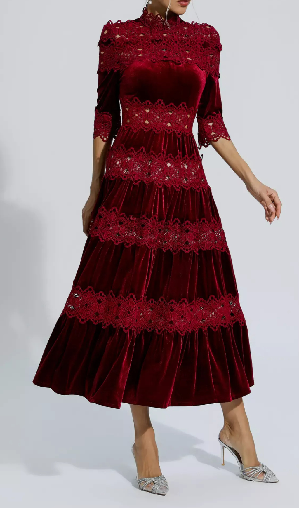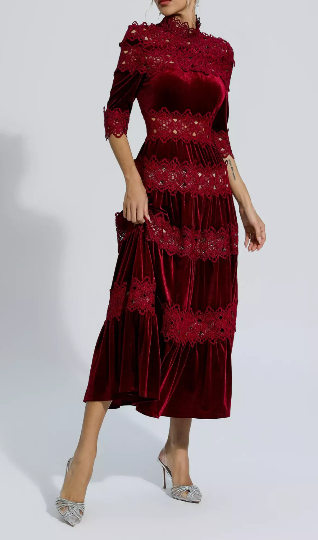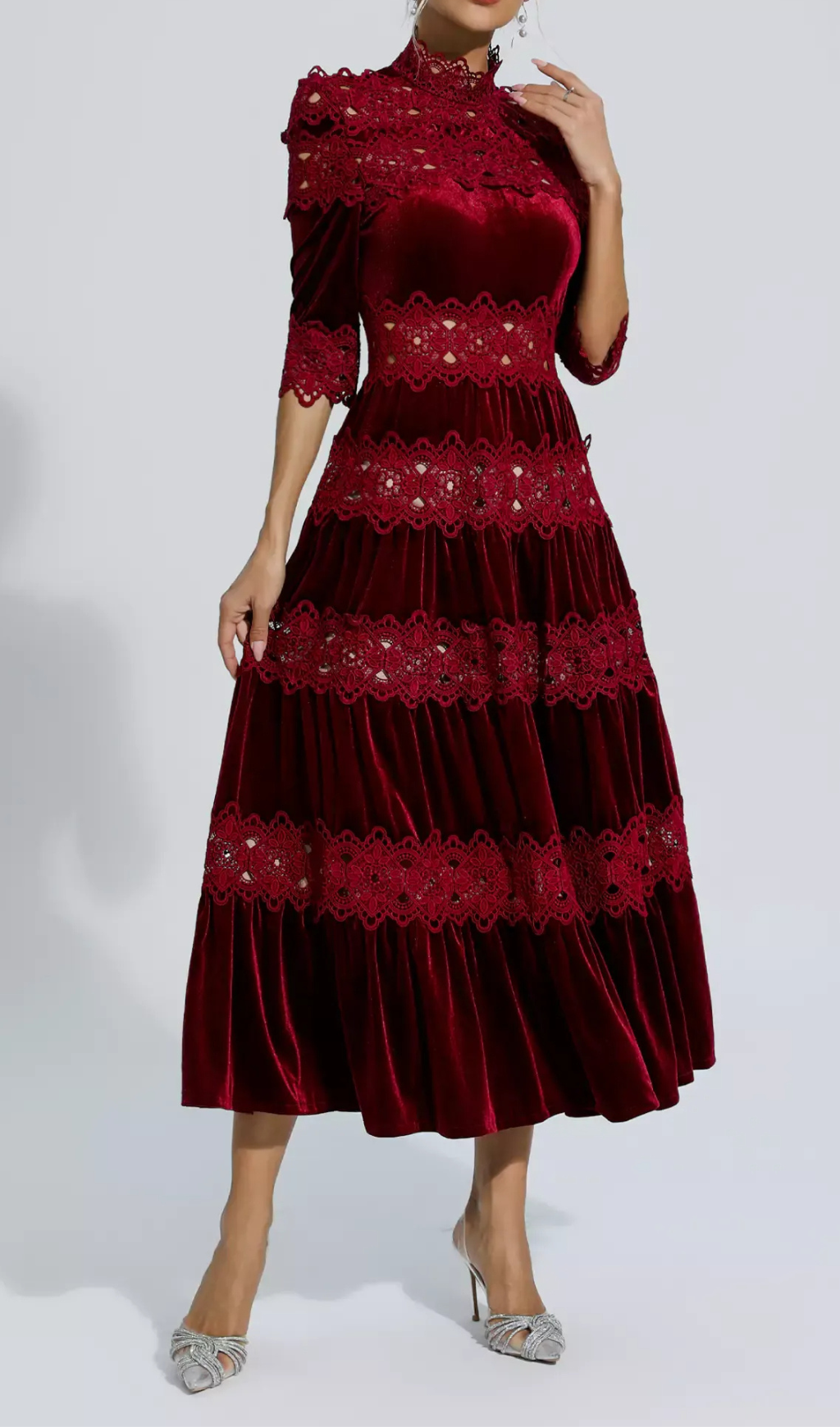 The intricately designed patchwork offers a unique touch, while the velvet fabric adds a rich texture. Perfect for special occasions, this dress will make you stand out and feel confident.