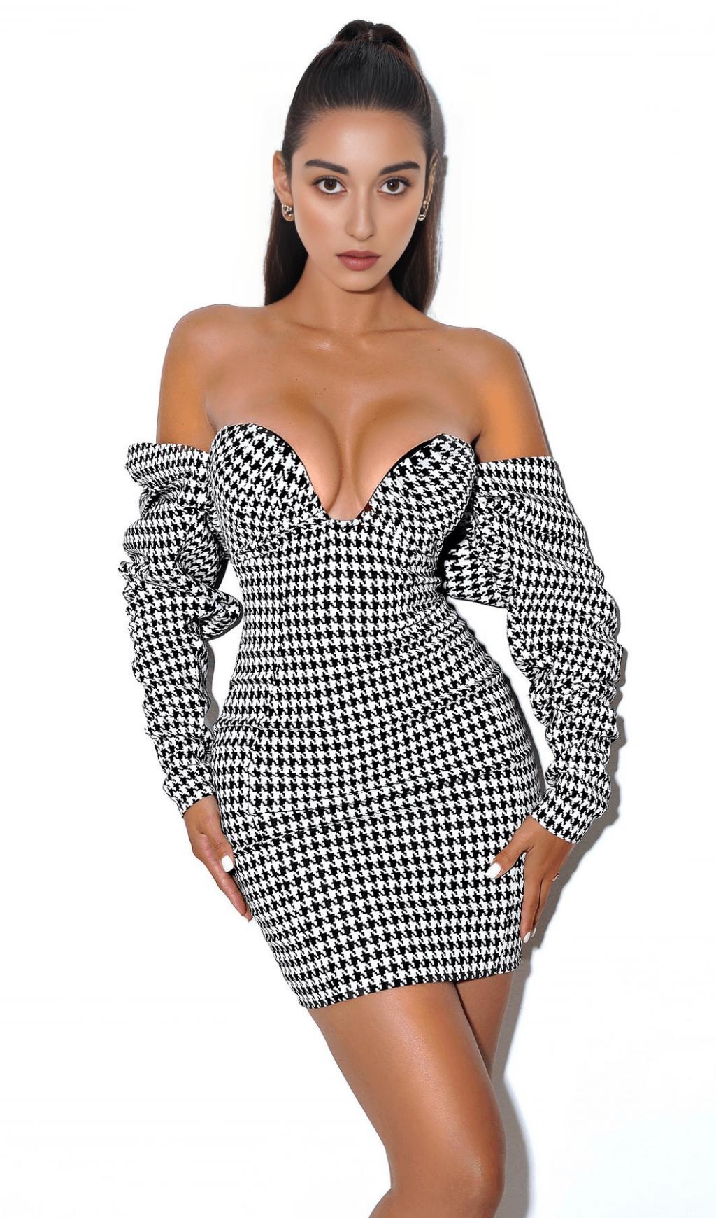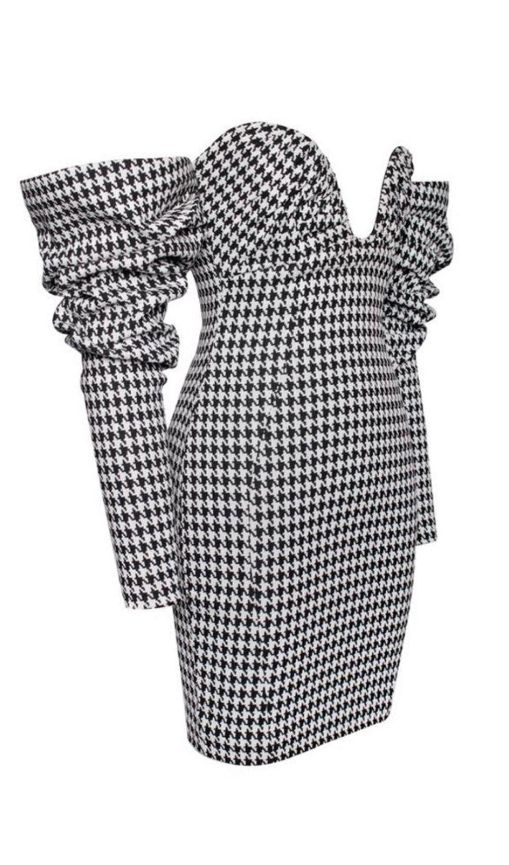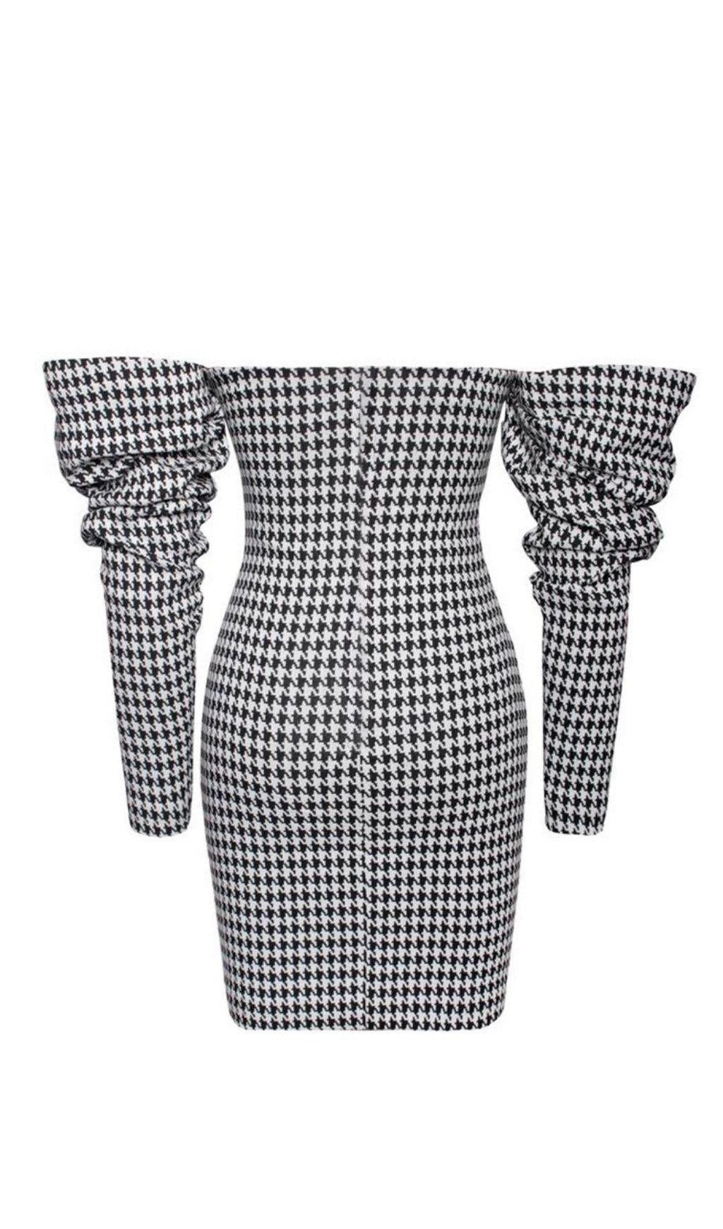 The HOUNDSTOOTH WORD SHOULDER WRAP DRESS is a stunning piece that combines classic houndstooth print with a modern shoulder wrap design. This dress is perfect for those who want to make a bold fashion statement while staying elegant and sophisticated.