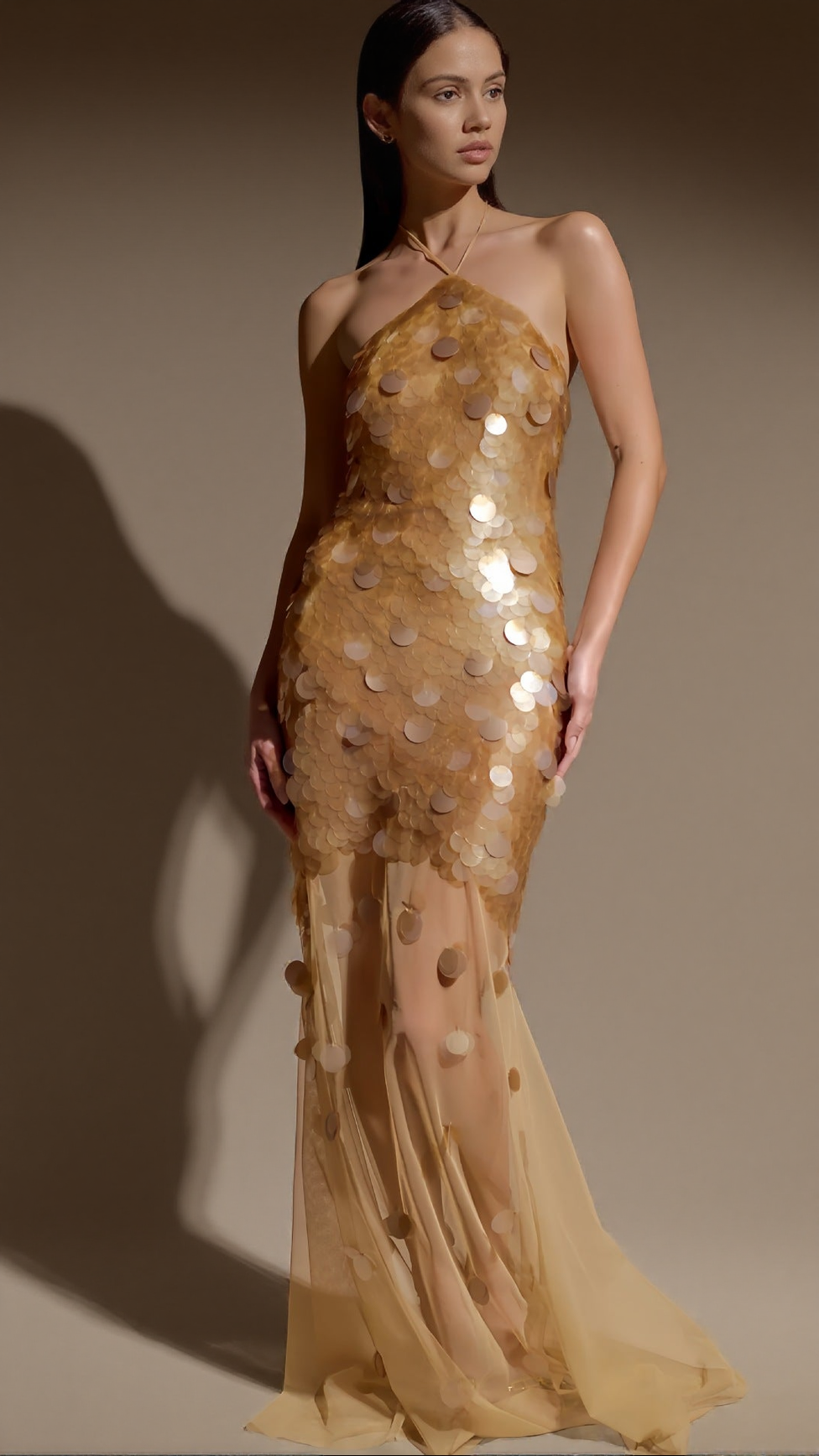 RADIANT GOLD SEQUIN HALTER MAXI DRESS - SHEER MESH GOWN FOR GLAMOROUS EVENINGS