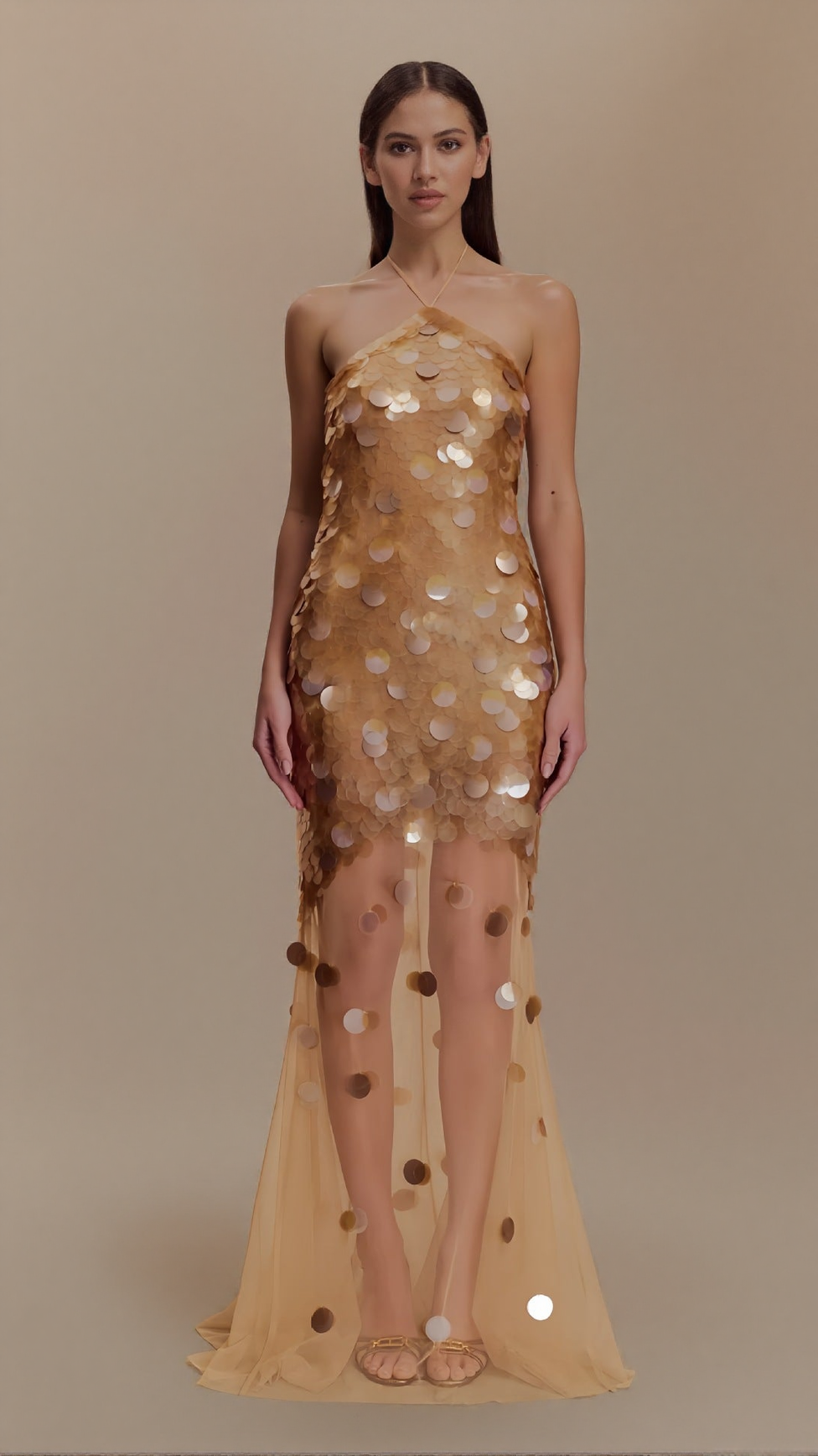 Prepare to captivate every gaze and make a truly unforgettable entrance with the Huber Halter Sequin Mesh Maxi Dress. This gown is a breathtaking fusion of bold glamour and sophisticated allure, designed for the woman who owns every room she walks into. Experience a masterpiece where shimmering gold sequins meet the tantalizing whisper of sheer mesh, creating an effect of unparalleled depth, mystery, and show-stopping brilliance.
