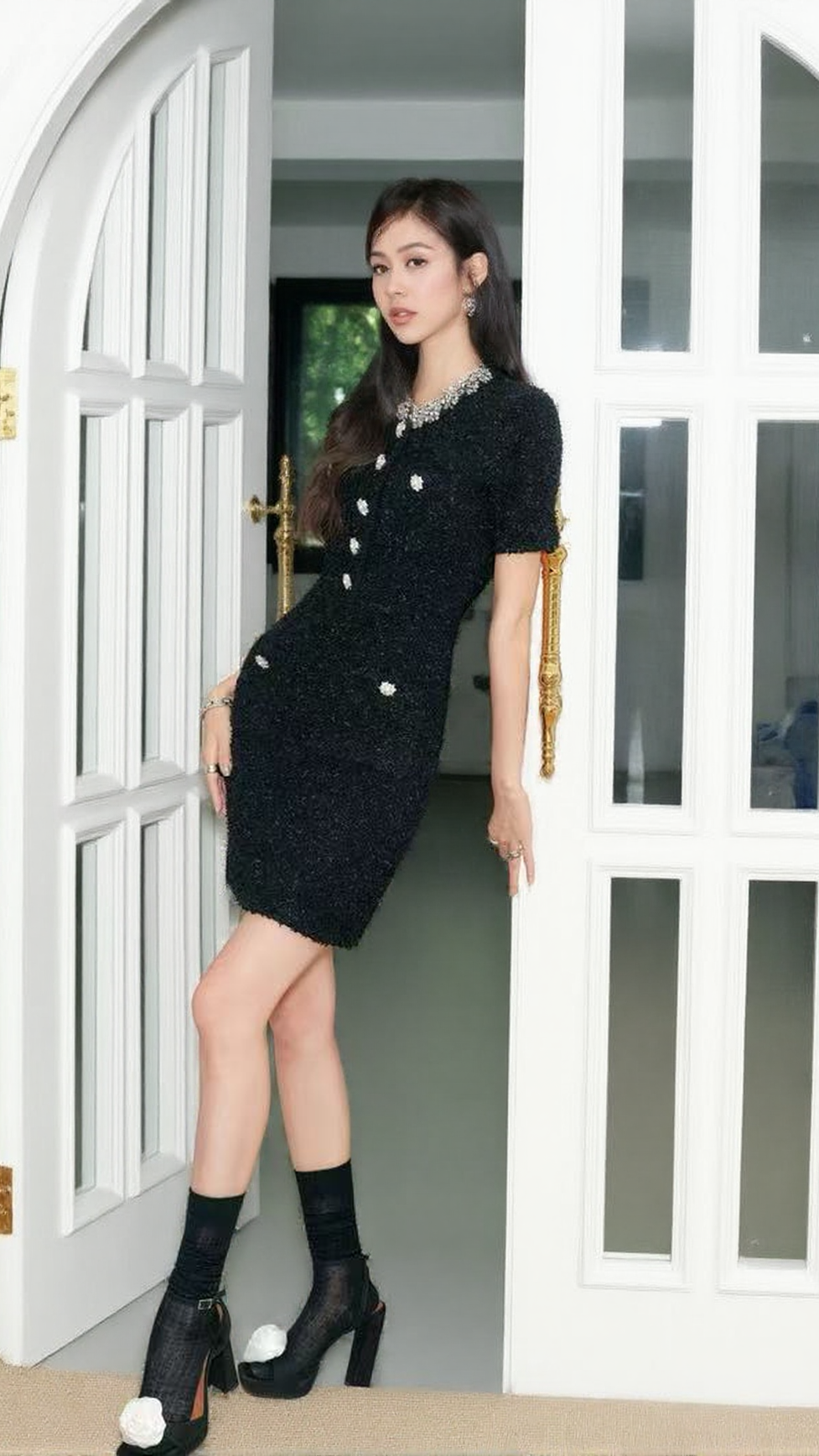 • Luxurious Textured Fabric: The rich, tactile black fabric (like a refined tweed or bouclé) adds depth, sophistication, and a high-end feel to the entire look.