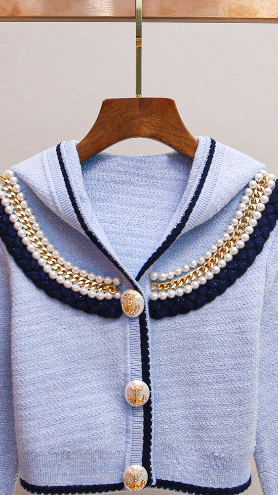HUMANA BLUE BEADED CARDIGAN | CHIC NAUTICAL KNIT WITH PEARL & ANCHOR DETAILS