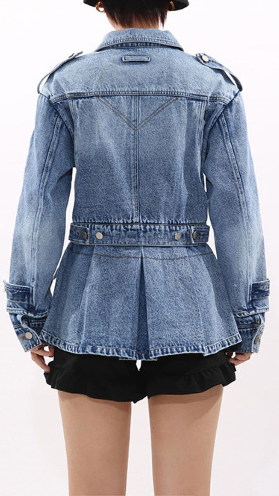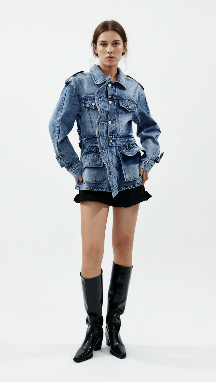 Reinvent your denim game with the Ila Denim Jacket, a true style statement designed for the modern woman. This isn't just another denim jacket; it's a meticulously crafted piece that blends timeless appeal with contemporary utility chic. Its unique silhouette features a flattering cinched, belted waist that defines your figure, while maintaining a comfortable, relaxed fit perfect for layering.