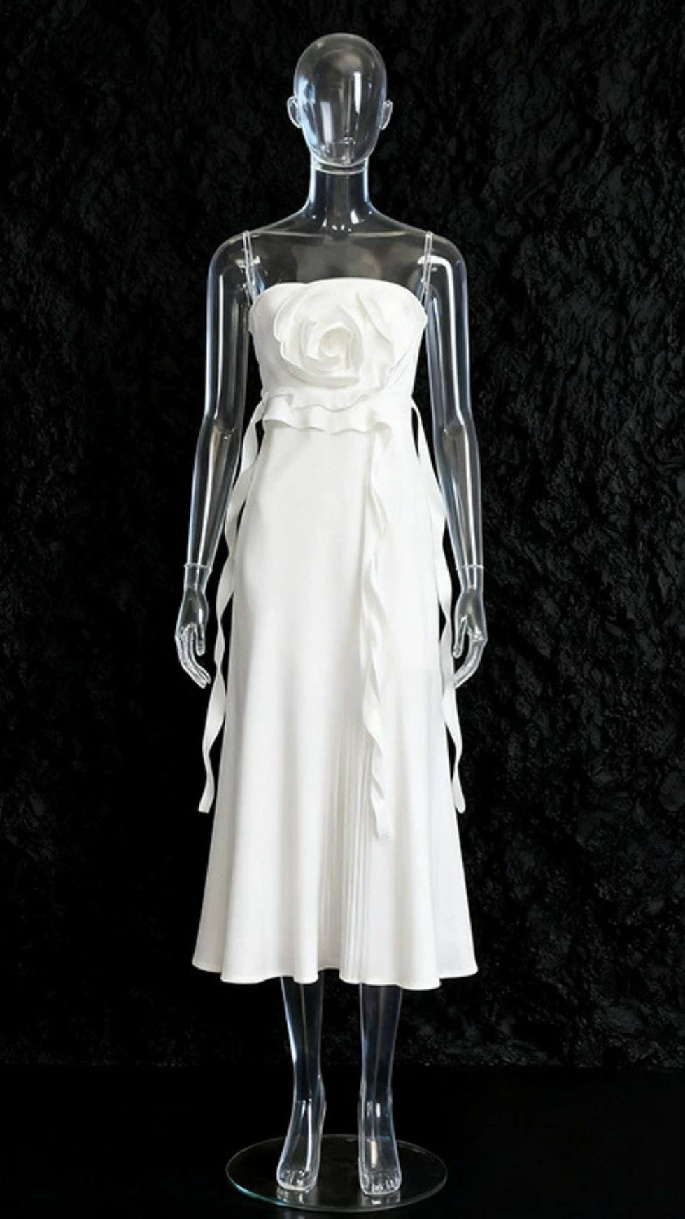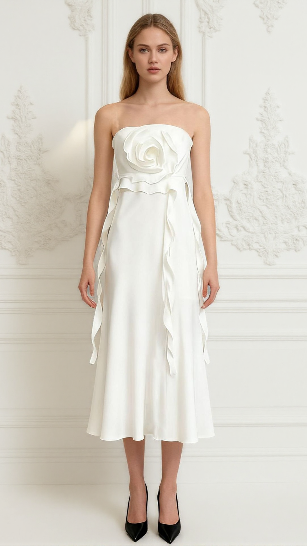 Crafted to flatter, the strapless neckline beautifully showcases your décolletage, while delicate, cascading ruffles gently flow down the sides, adding a touch of whimsical movement. The graceful midi length provides a timeless silhouette, perfect for gliding through any event with confidence and style.