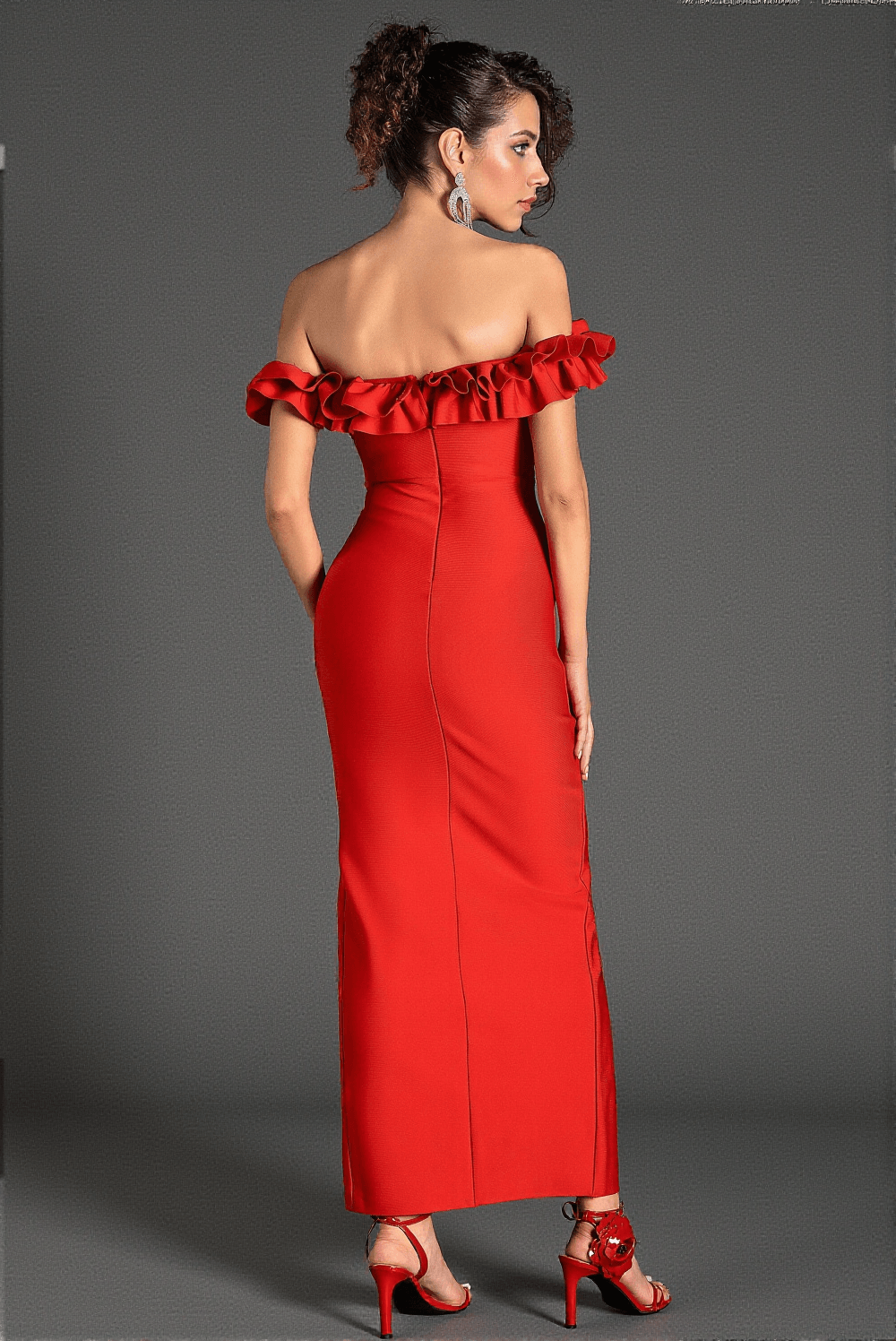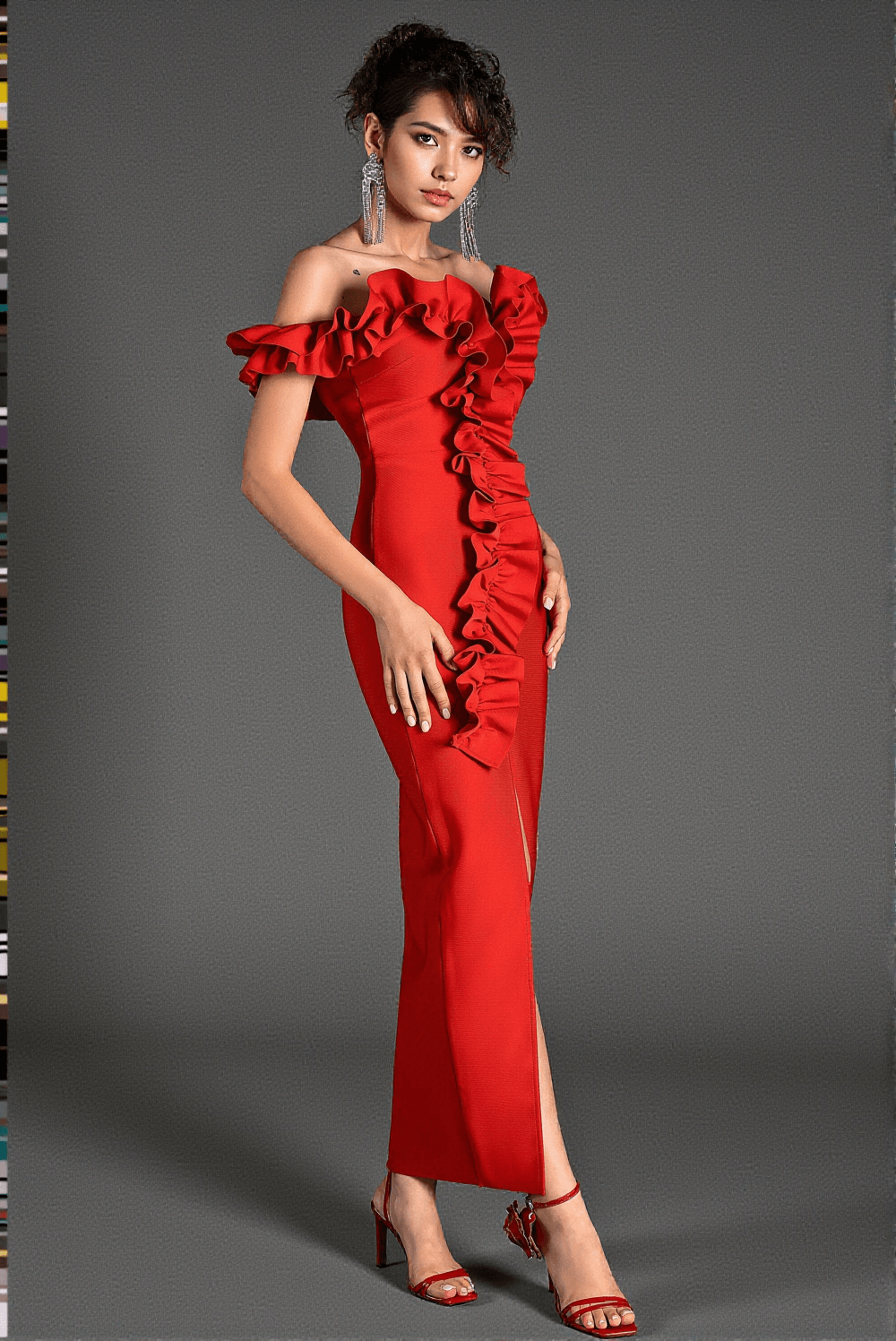The Ioulitta Ruffle High Slit Bandage Dress is designed with intricate details that highlight your unique style. With a daring high slit and delicate ruffles, this dress promises to be the centerpiece of any ensemble.