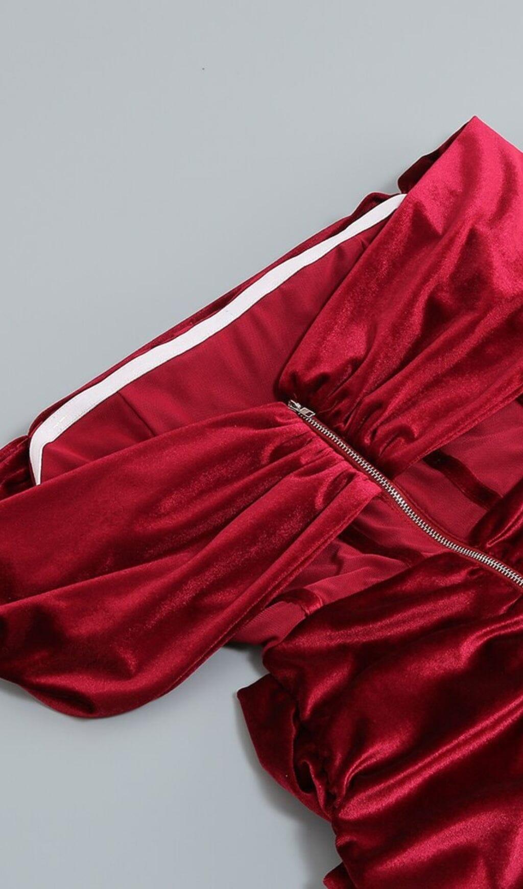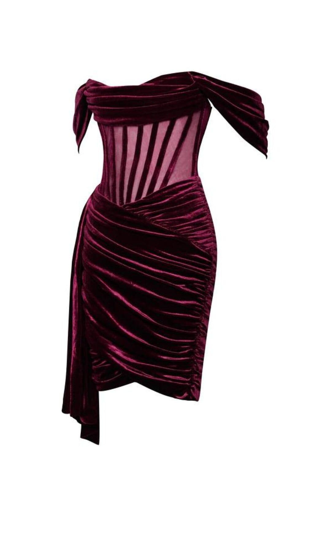 IRISA BURGUNDY DRAPING OFF SHOULDER CORSET DRESS