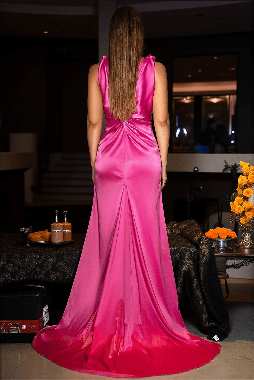 Featuring a dramatic deep V neckline that accentuates sophistication and allure, this dress is crafted for the woman who wants her entrance to be memorable. The neckline draws eyes while maintaining an elegant subtlety.