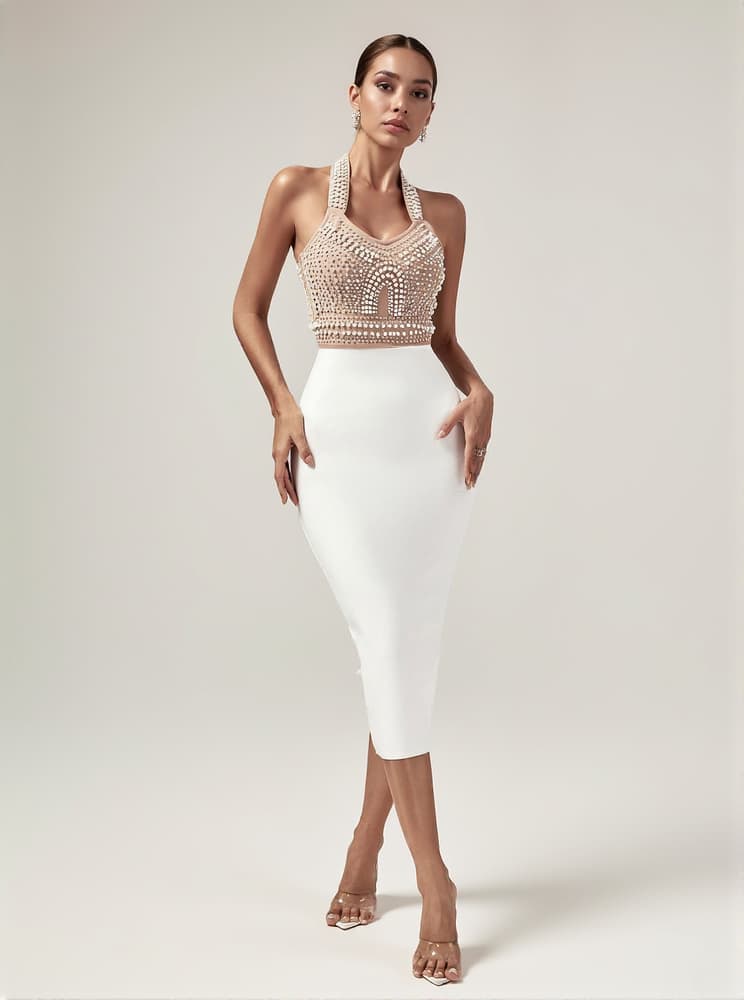 Turn heads wherever you go in this super chic embellished bandage dress. Made from stretchy bandage fabric, the Isabelle Halterneck Pearls Bandage Dress In Beige features a sleeveless halter bodice with an open back, a deep V-neckline, and a pearl bodice that accentuates the curves of the body. Pair this bandage dress with strappy heels or pointy toe pumps for a stunning head to toe look.