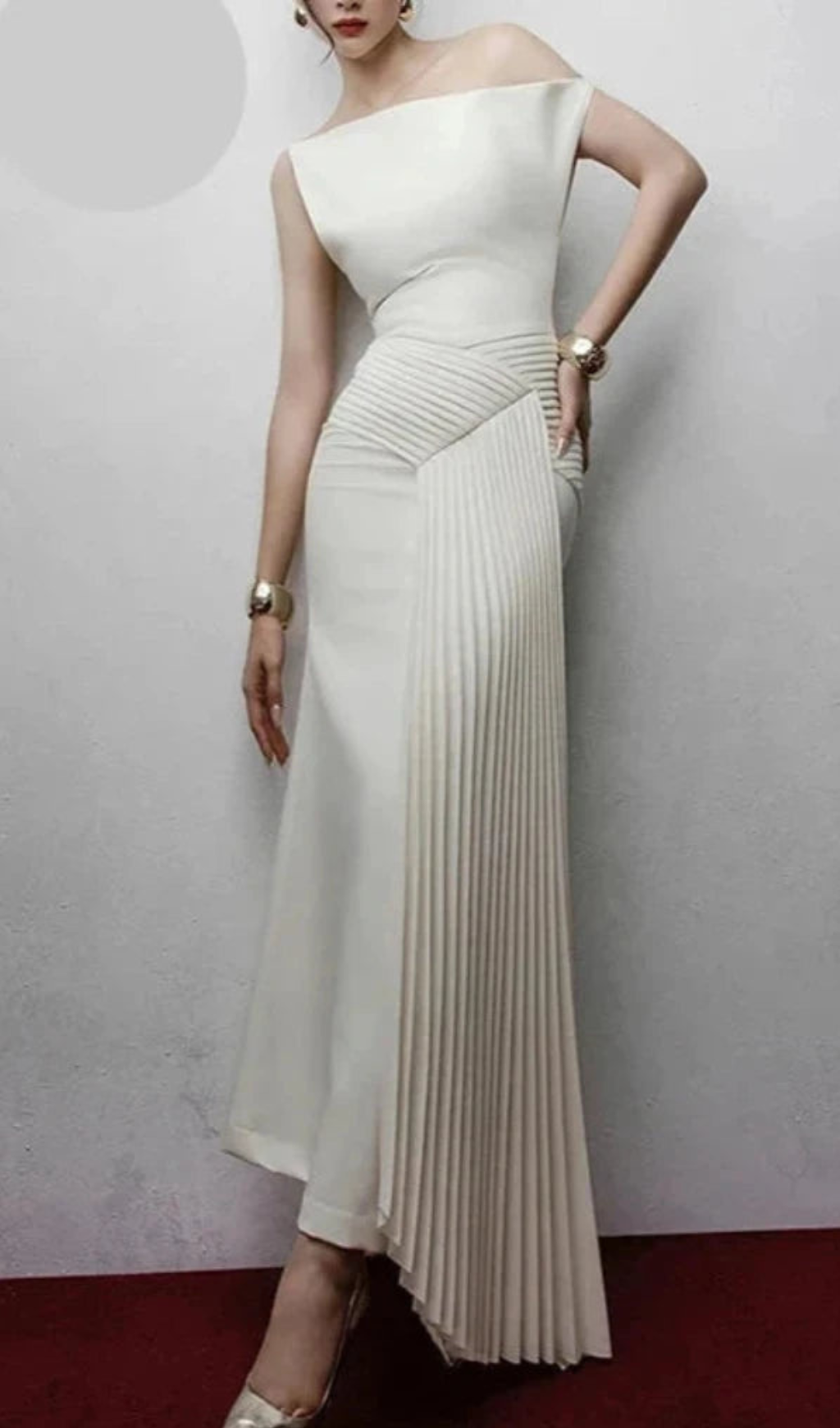 Featuring a unique asymmetrical design and flattering ruched detailing, this dress is sure to make you stand out at any event. The soft and flowy fabric creates a timeless and luxurious look, perfect for any special occasion.