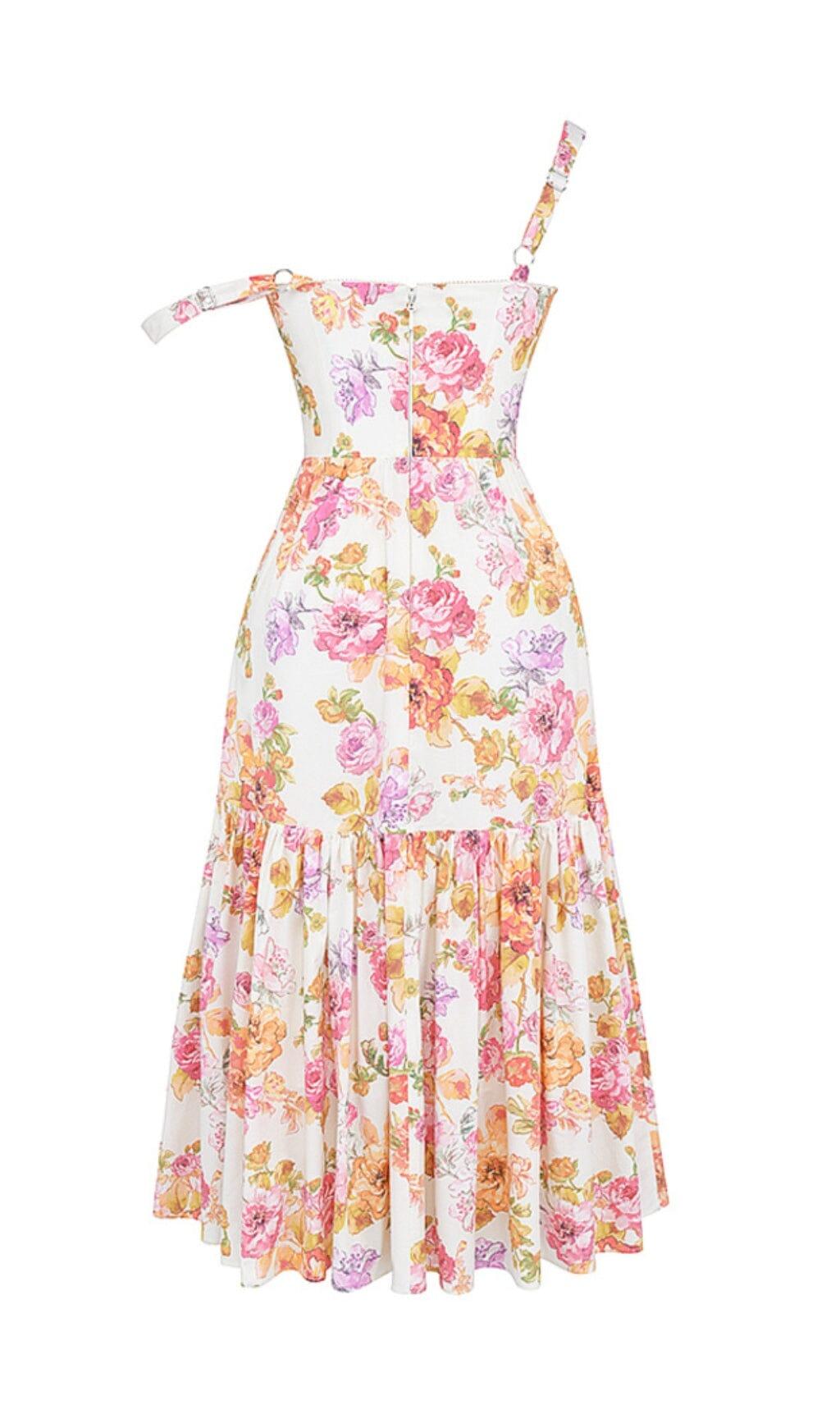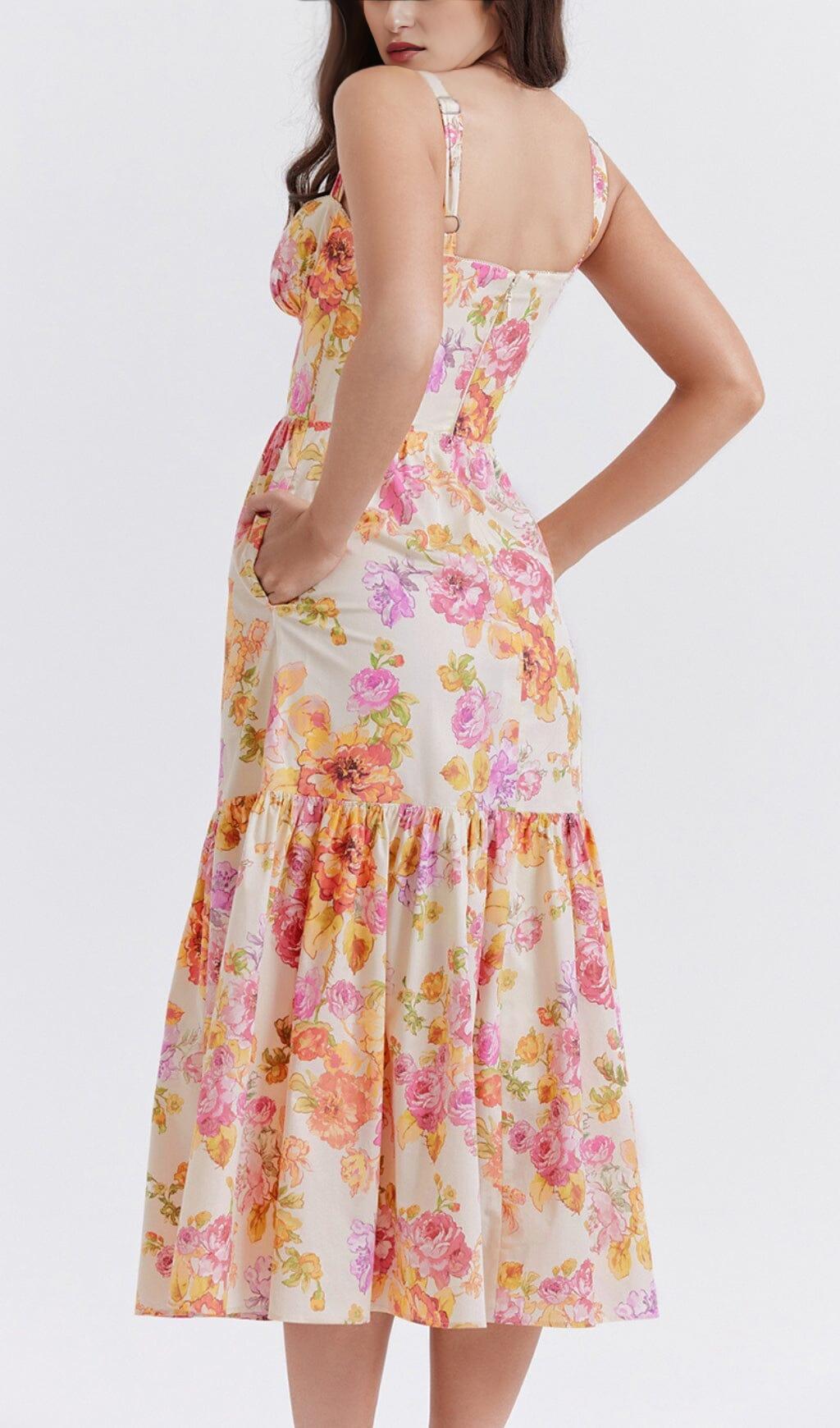 Experience the essence of spring with our Ivory Floral Midi Sundress. Made from stretch cotton, this dress is not only comfortable but also features a beautiful floral pattern that exudes femininity. The sweetheart neckline with underwired cups provides ultimate support and flatters your bust, while the corsetry boning cinches your waist for a stunning silhouette.