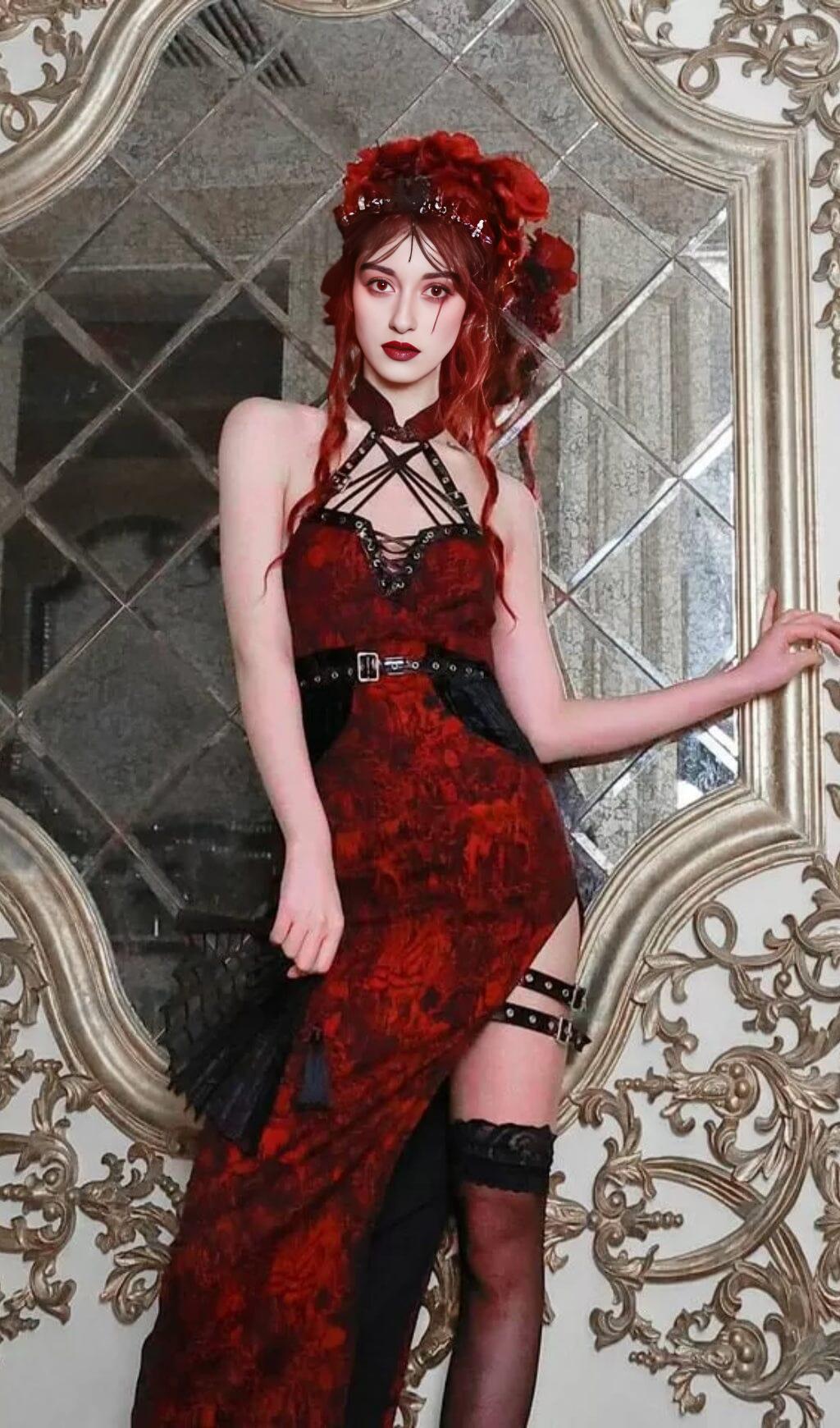 This eye-catching, edge-of-the-envelope dress combines the elegance of traditional jacquard with a modern, gothic flair. With its thigh-high slits, this dress exudes a daring and risqué silhouette, while maintaining a romantic and captivating look. Prepare to turn heads wherever you go as you showcase your unique sense of style.