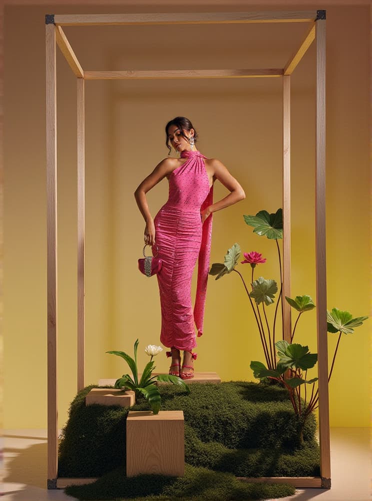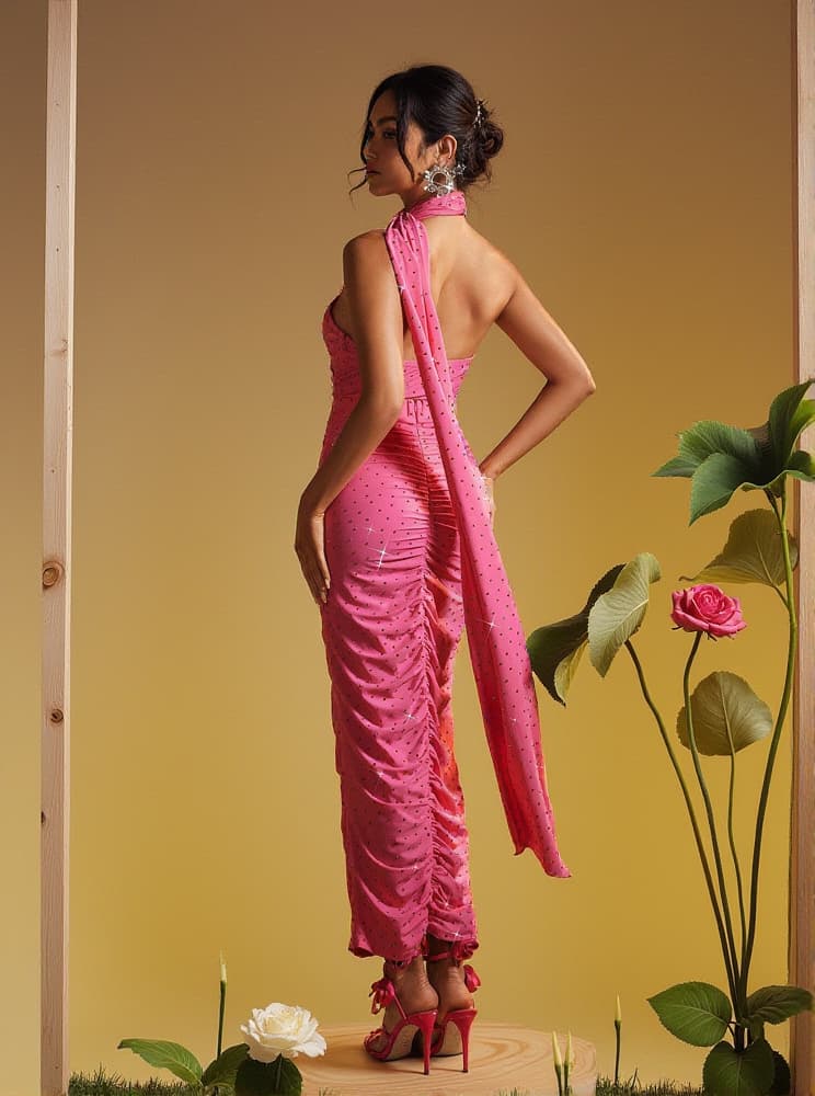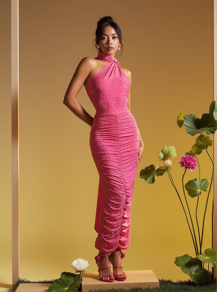 As an industry expert, I present to you the Jesiah Halterneck Crystal Draped Maxi Dress. This stunning dress features a halter neckline and crystal draping for a touch of elegance. The perfect option for special occasions and gatherings, this dress exudes glamour and sophistication.