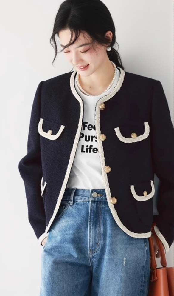 Jill Tweed Contrast Trim Jacket in navy blue