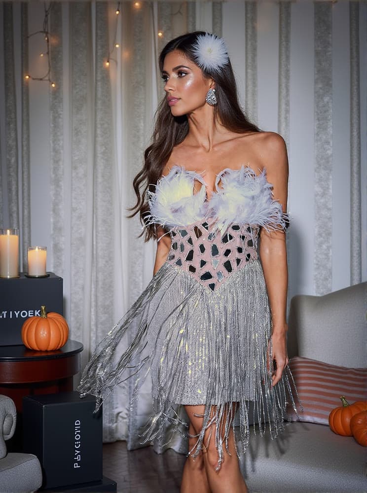 Notice: Please note due to the material of this dress, some feathers might fall. This is not a fault.