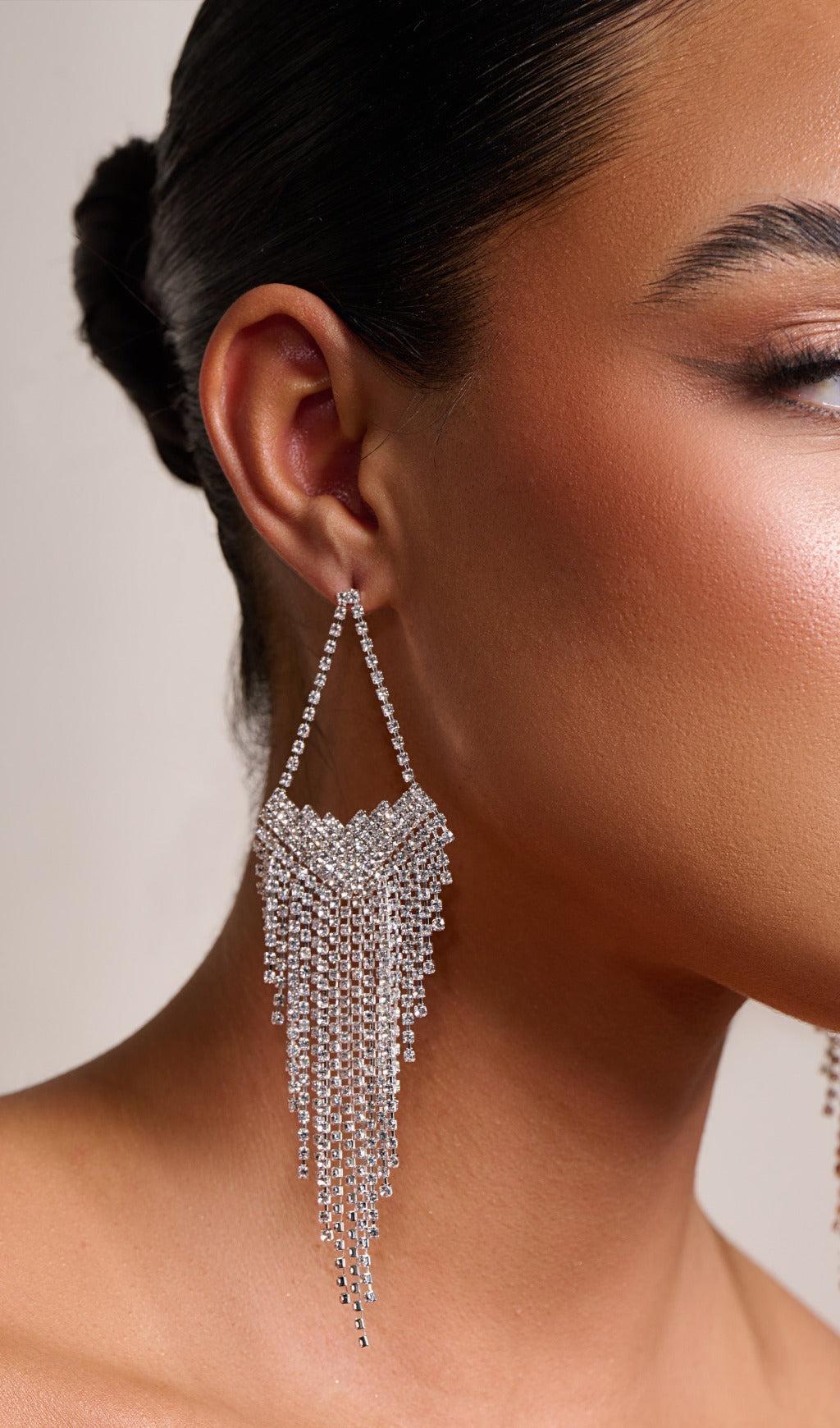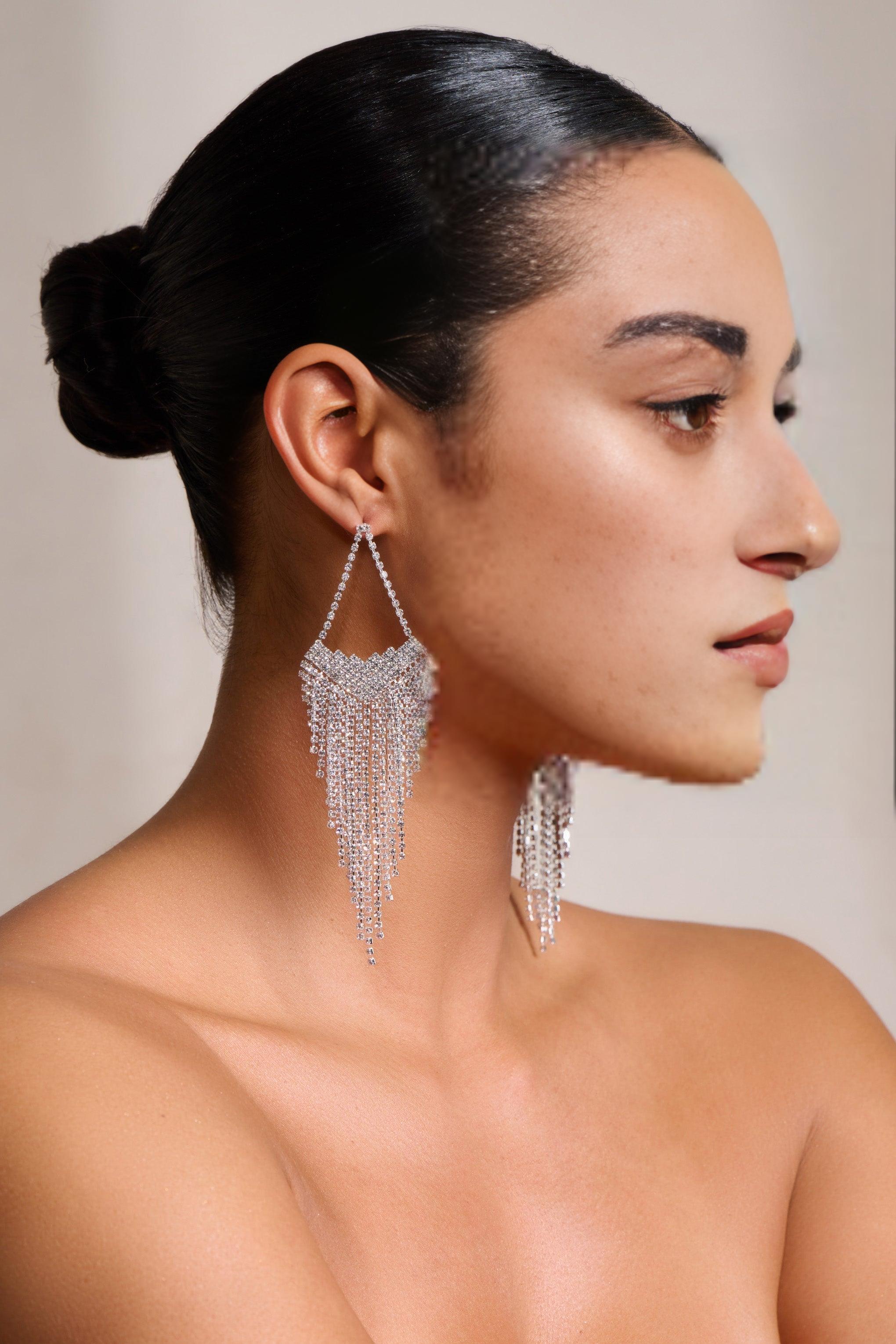 Elevate your style this party season with our Silver Statement Teardrop Tassel Earrings. These stunning earrings are the perfect accessory to add a touch of sparkle and elegance to any outfit. With delicate crystals that cascade down silver-toned tassels, these earrings will make you the center of attention wherever you go.
